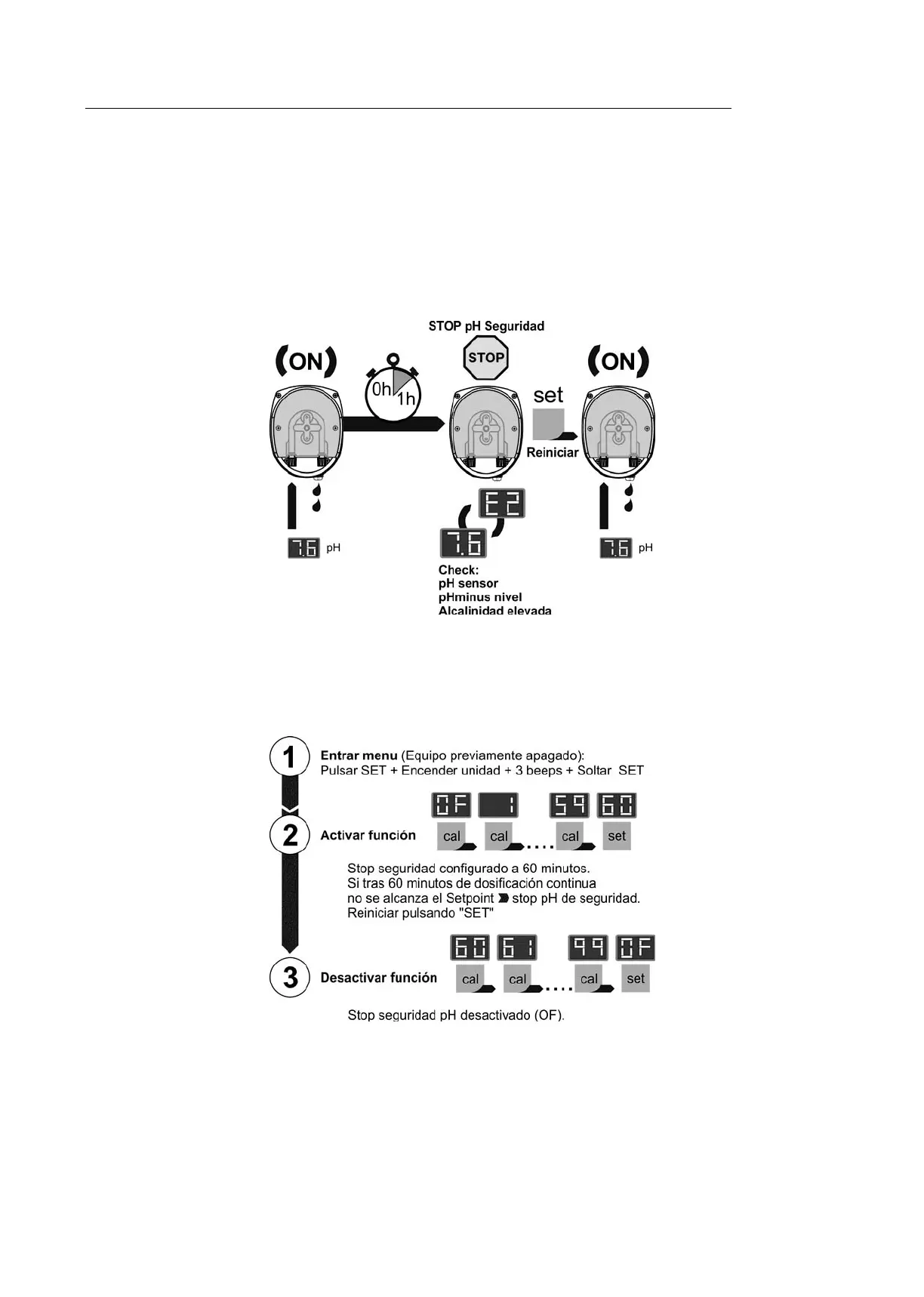 El controlador de pH integrado dispone de un sistema de seguridad (FUNCION PUMP-STOP) que actúa sobre la bomba dosificadora el cual