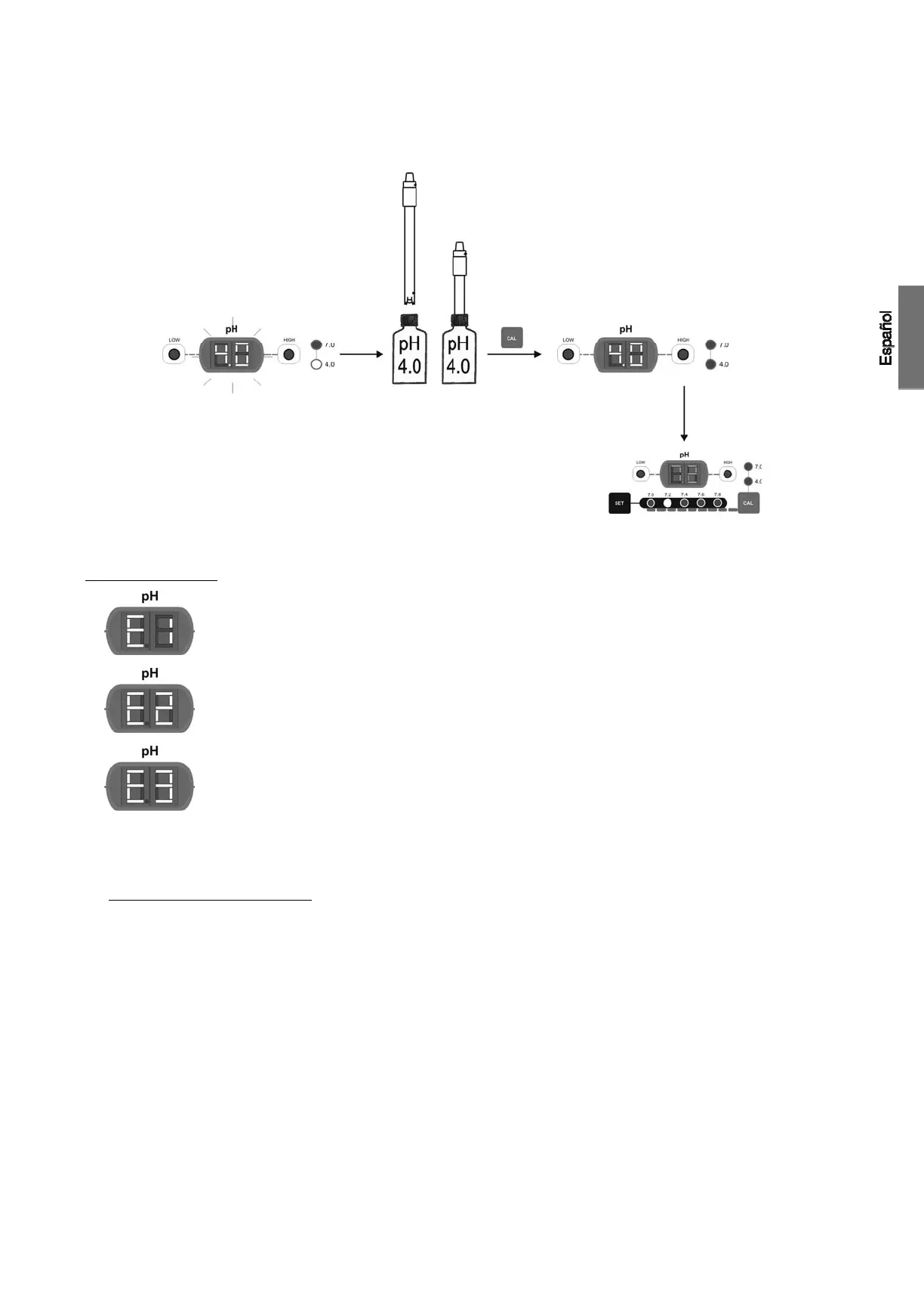 disolución patrón pH=4.0 (color rojo). Agitar suavemente unos segundos y pulsar la tecla “CAL” [18]. Una vez estabilizada la