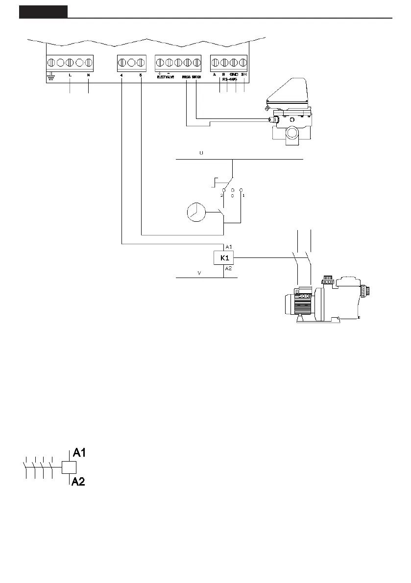 A1 / A2 sind die Anschlüsse für die Spule des Schaltschützes der Filterpumpe. Der