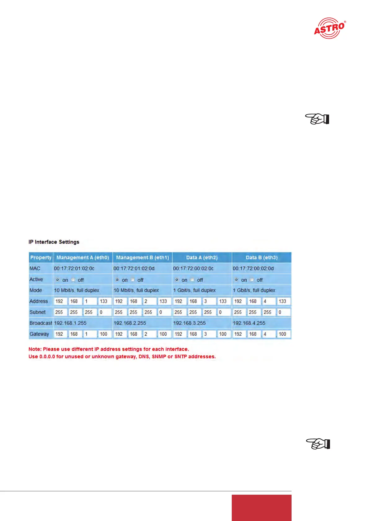 The "IP Interface Settings" area is used to make the settings for the four IP interfaces (Manage-