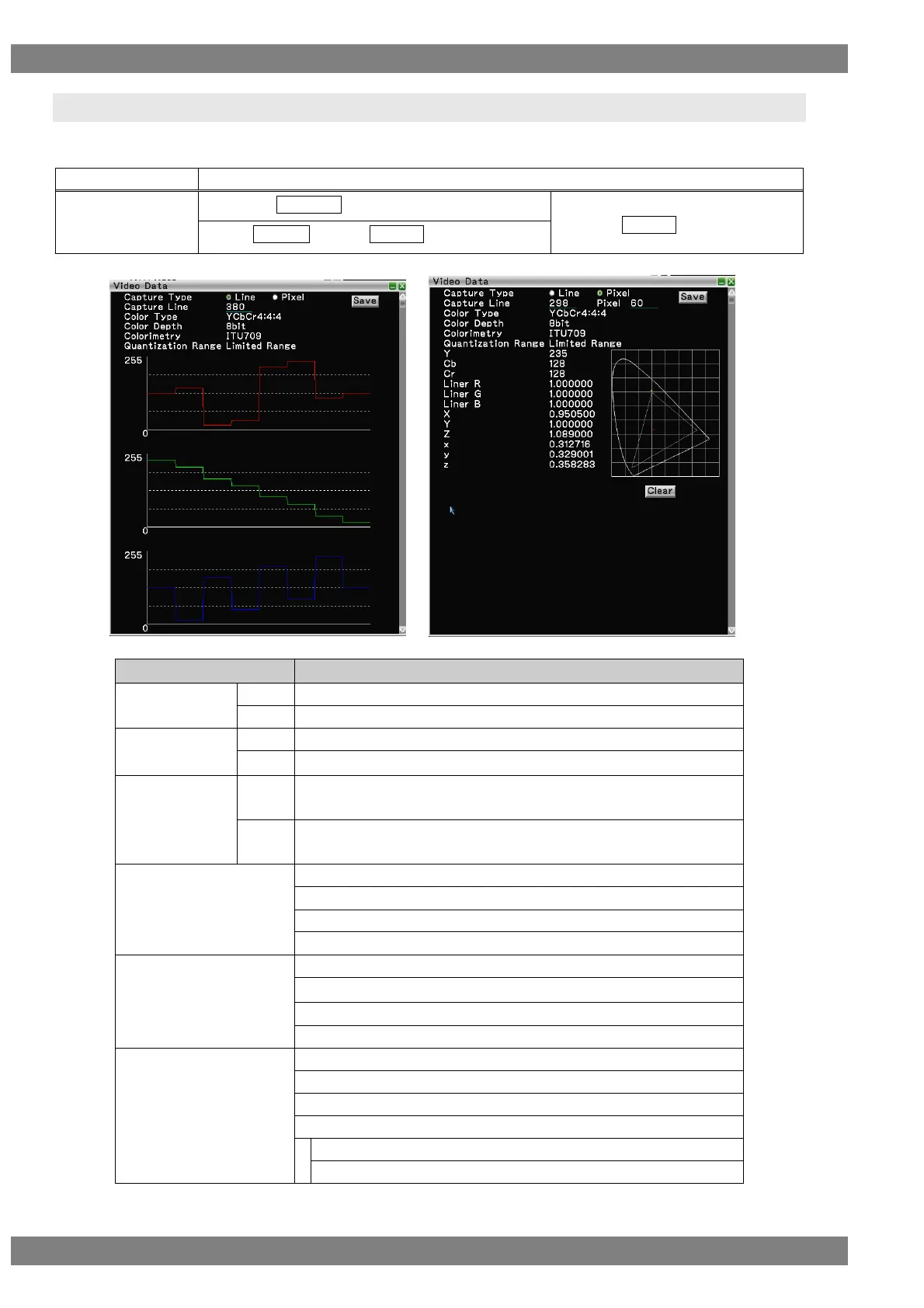 Saves the RBG data and YCbCr data of 1 line set in Capture Line as