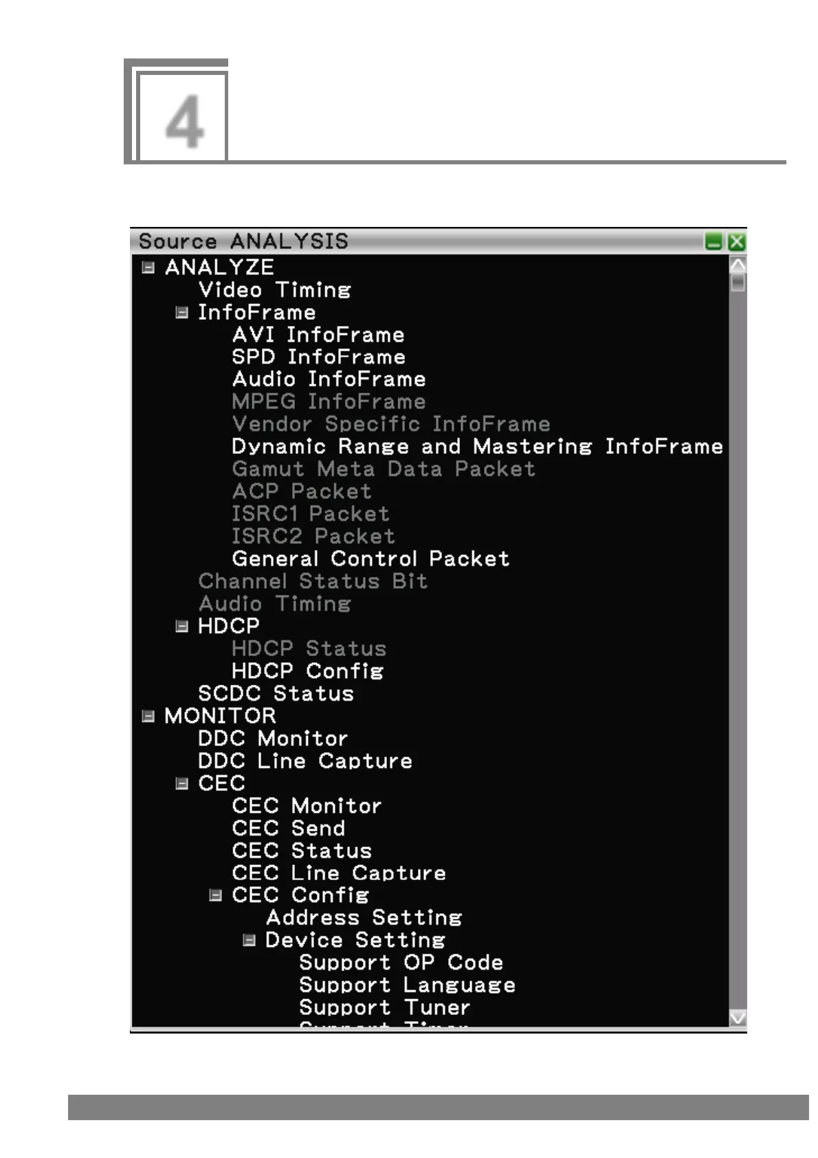 You can measure the timing of HDMI signals and decode and display InfoFrame and other content.