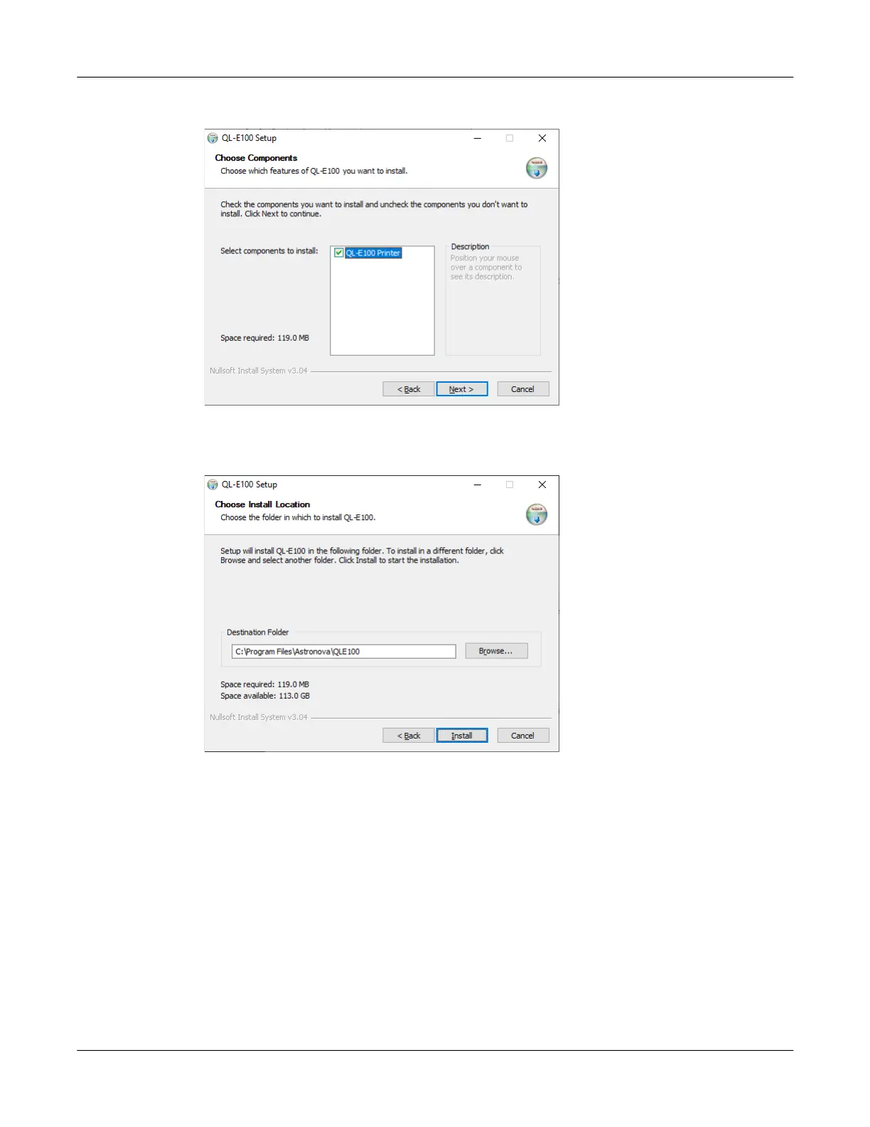 Make sure the QL-E100 Printer option is selected. Then choose the Next button.
