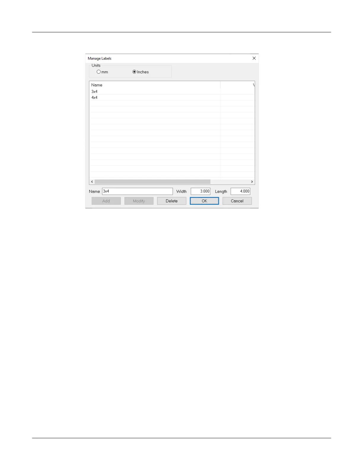 • To edit a label size, select it from the list and modify its settings. Then choose Modify.