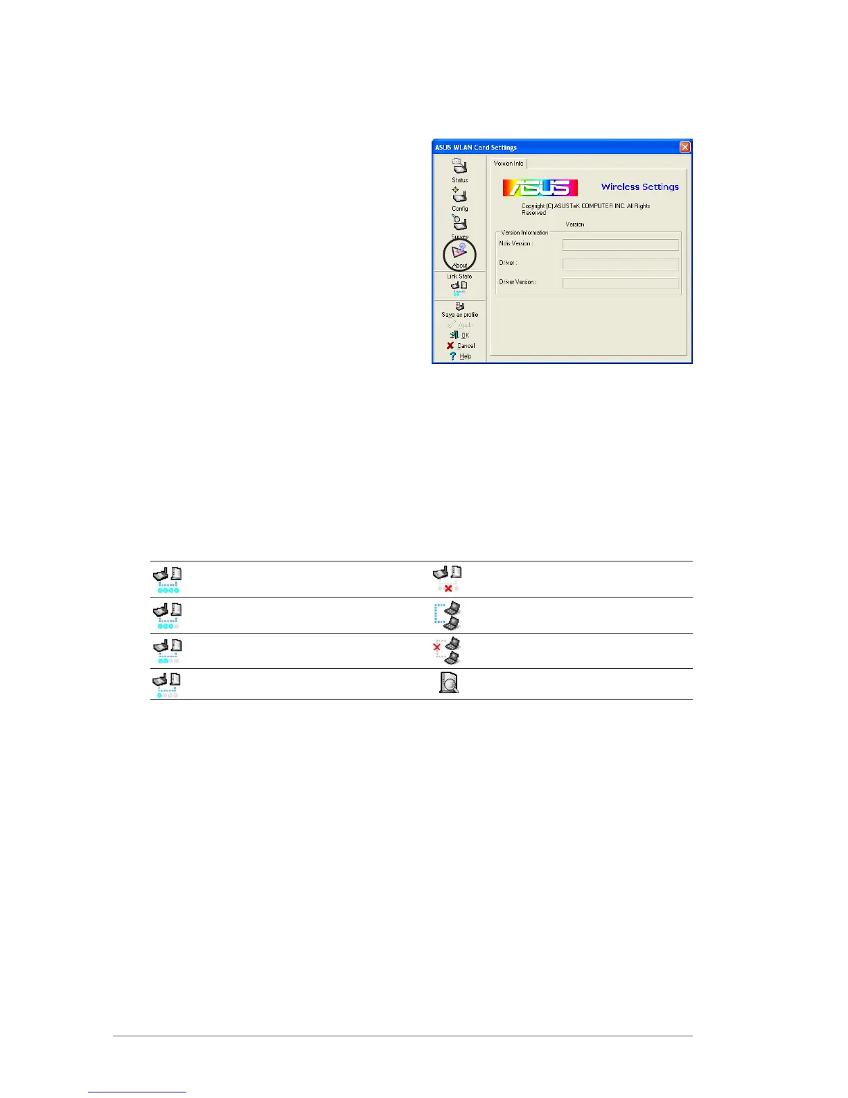 Displays the current connection status of the wireless LAN adapter to the