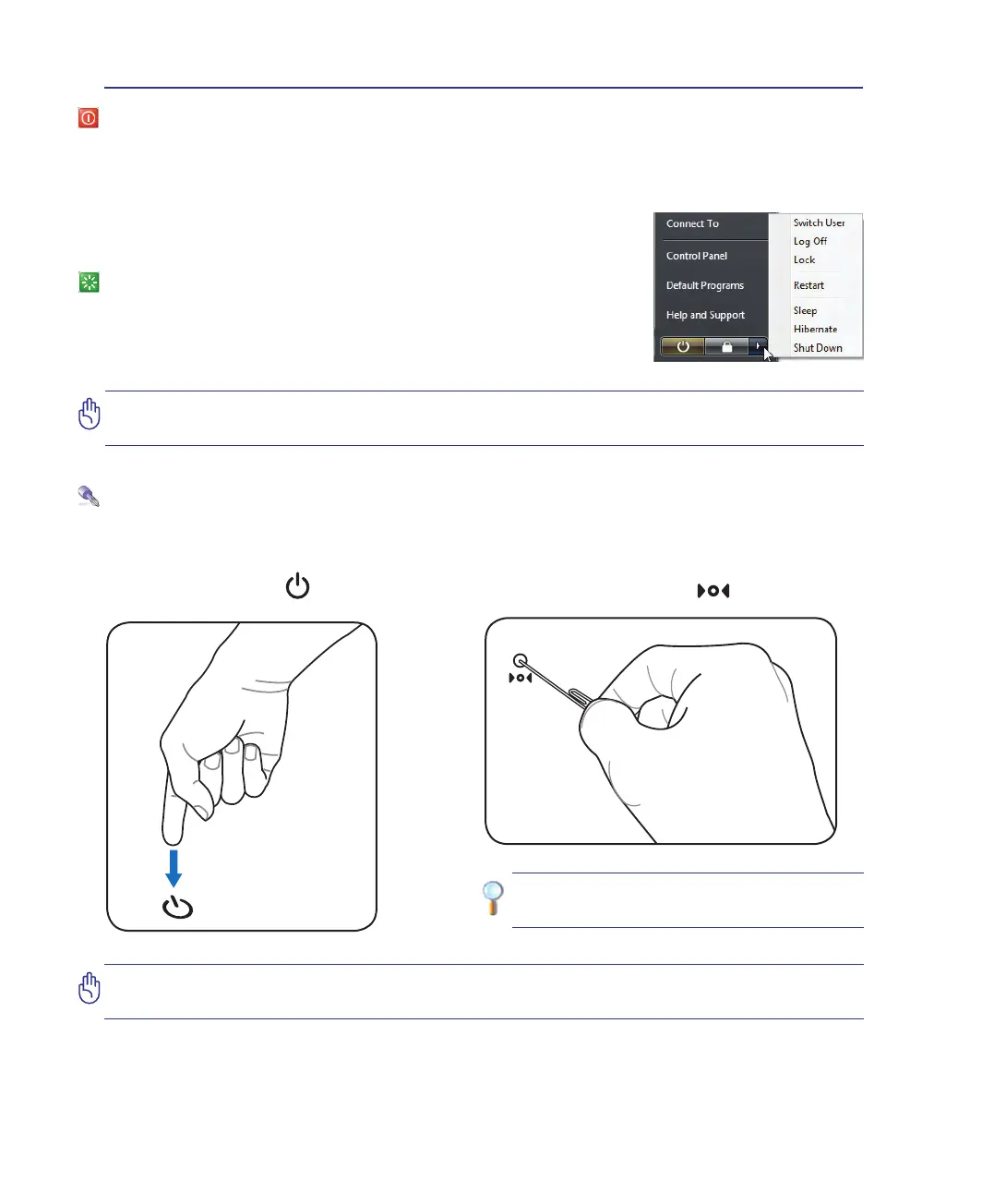 The power switch turns ON and OFF the Notebook PC or putting the Notebook PC into sleep or hiberna-