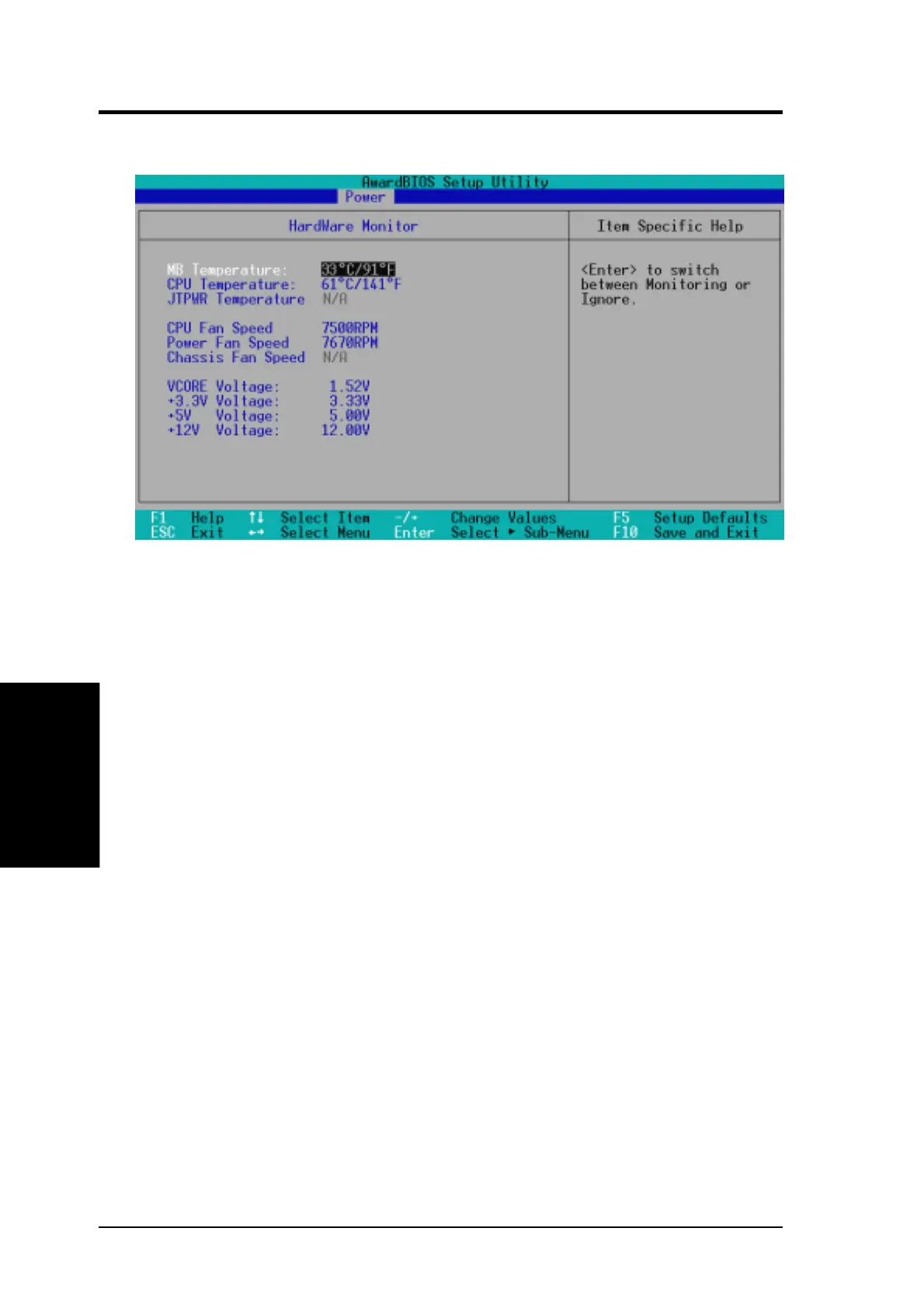 CPU and power supply temperatures. Set to [Ignore] only if necessary.