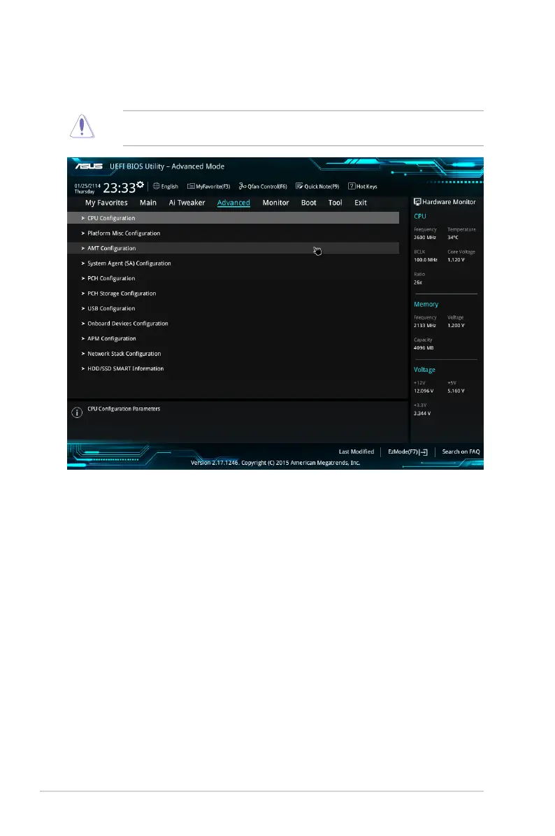 Be cautious when changing the settings of the Advanced menu items. Incorrect eld values