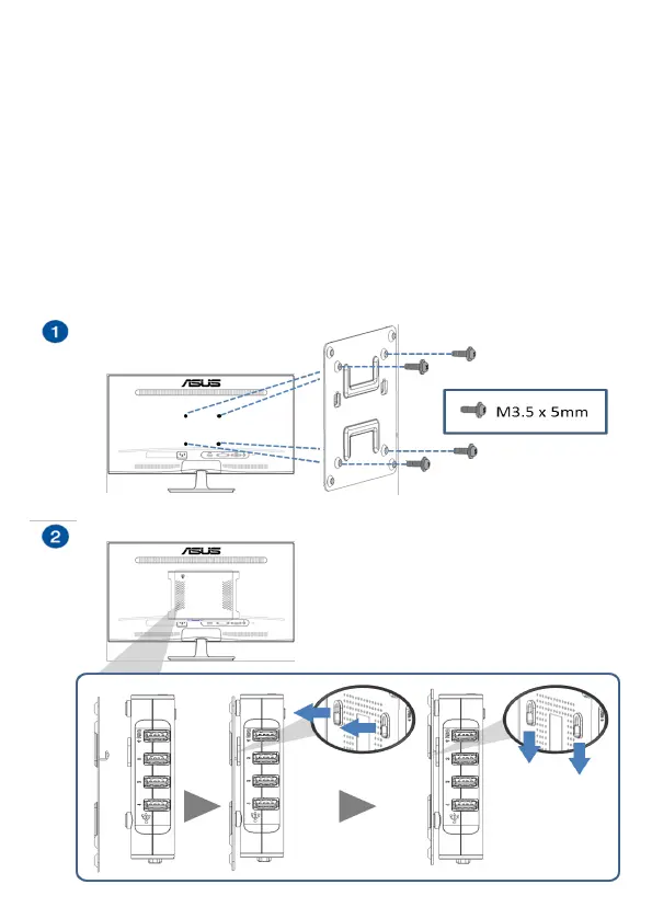 1. Aach the wall mount bracket to the back of display and x with the
