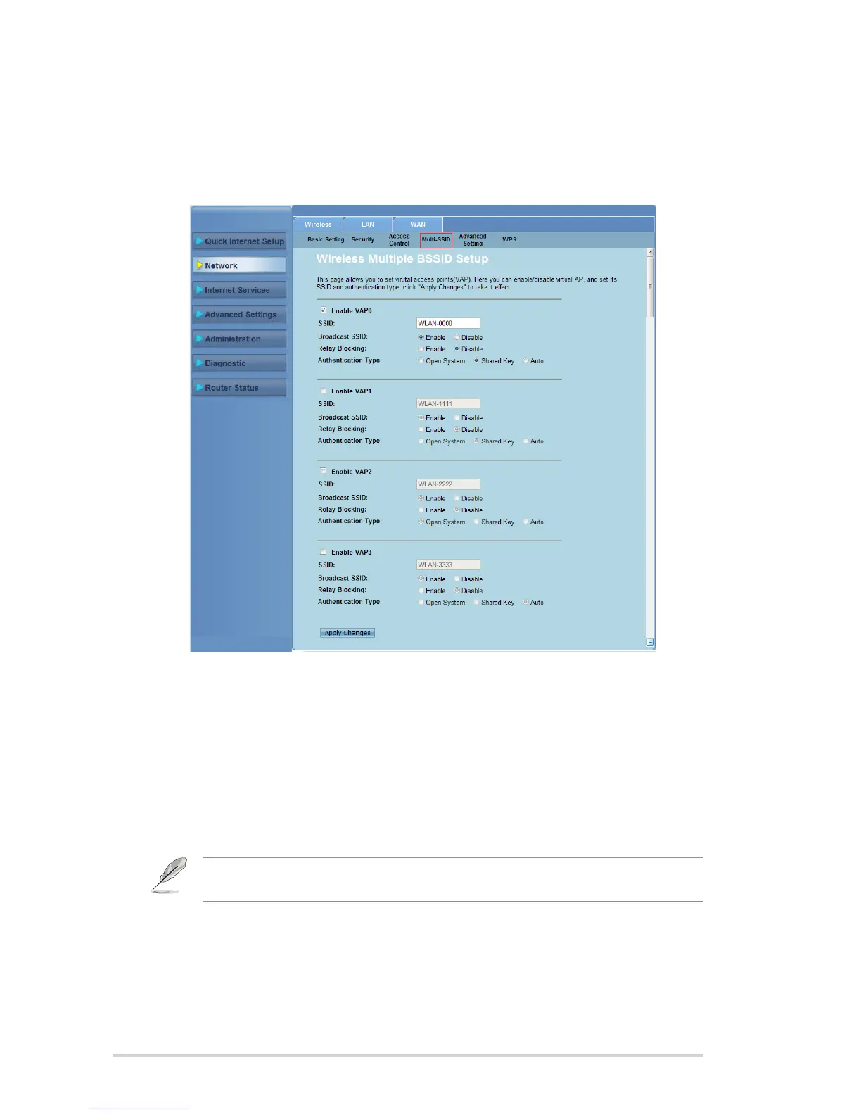 The Multi-SSID page allows you to enable or disable a virtual access point (VAP)