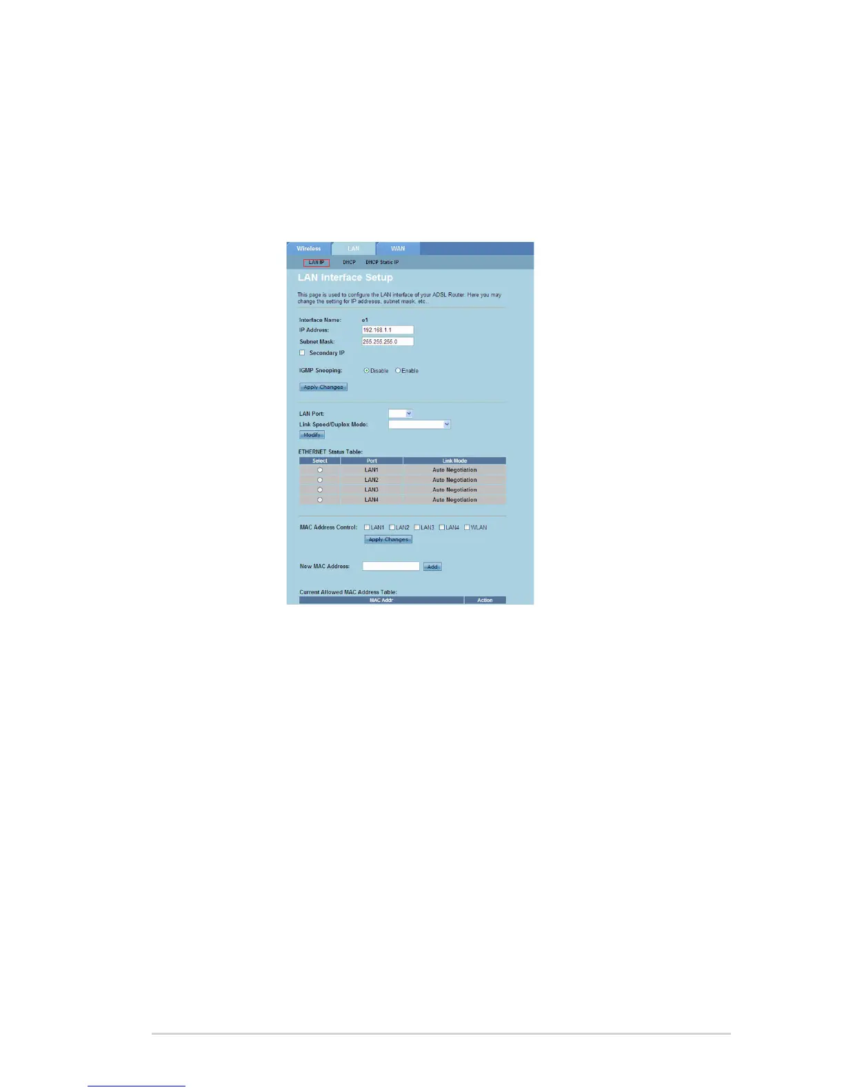 The LAN IP Interface Setup page allows you to congure the interface of your local