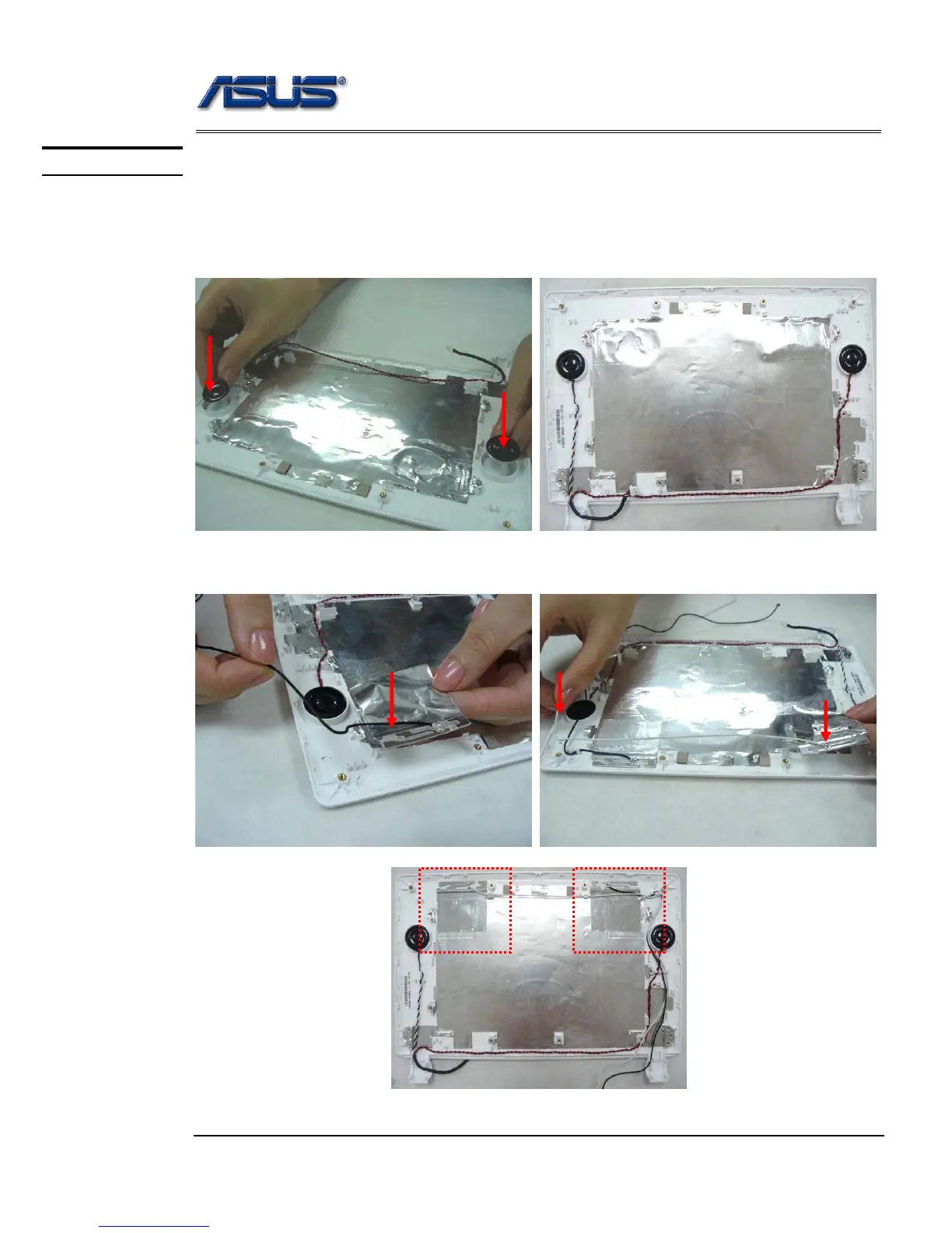 1. Install the two speakers on LCD back cover and arrange the speaker cable well through cable