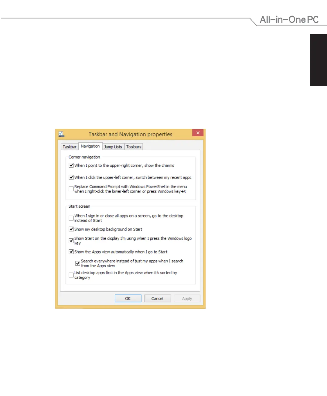 3. Click Properties then select the Navigation tab to tick the Navigation and Start screen