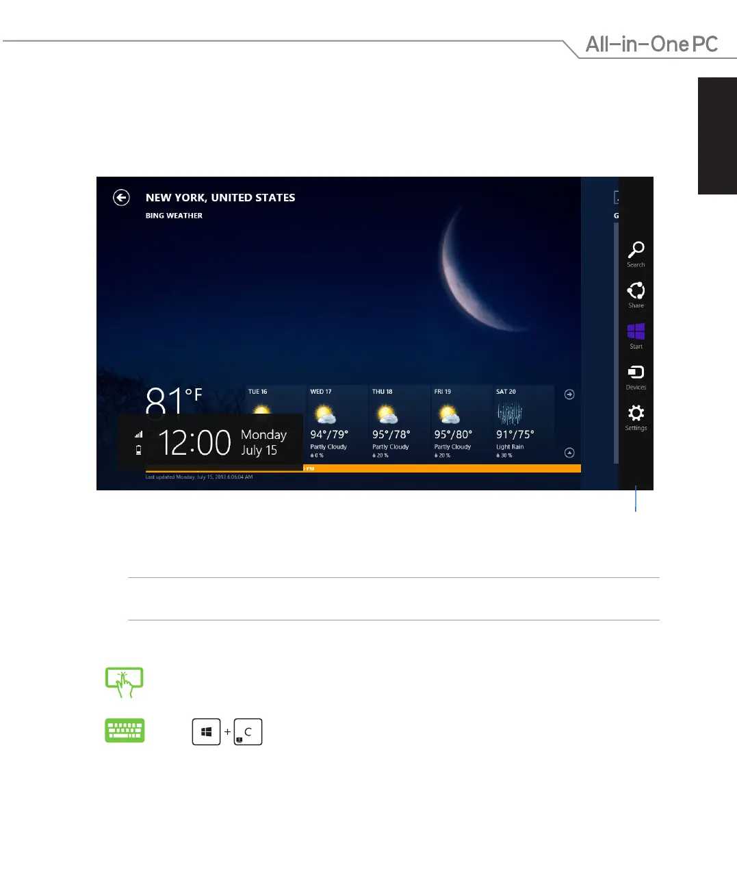 Use your ASUS All-in-One PC’s touch screen panel or keyboard to launch the charms bar.