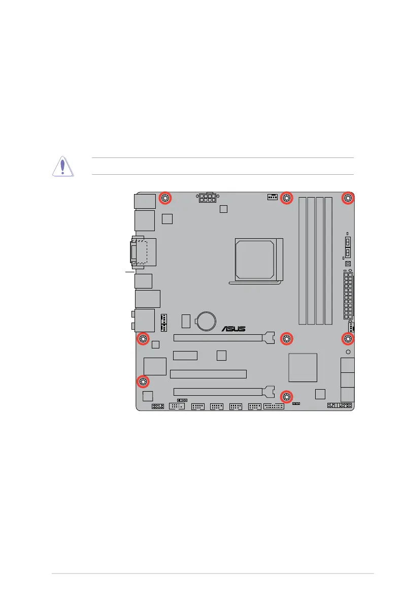 Place eight screws into the holes indicated by circles to secure the motherboard to the