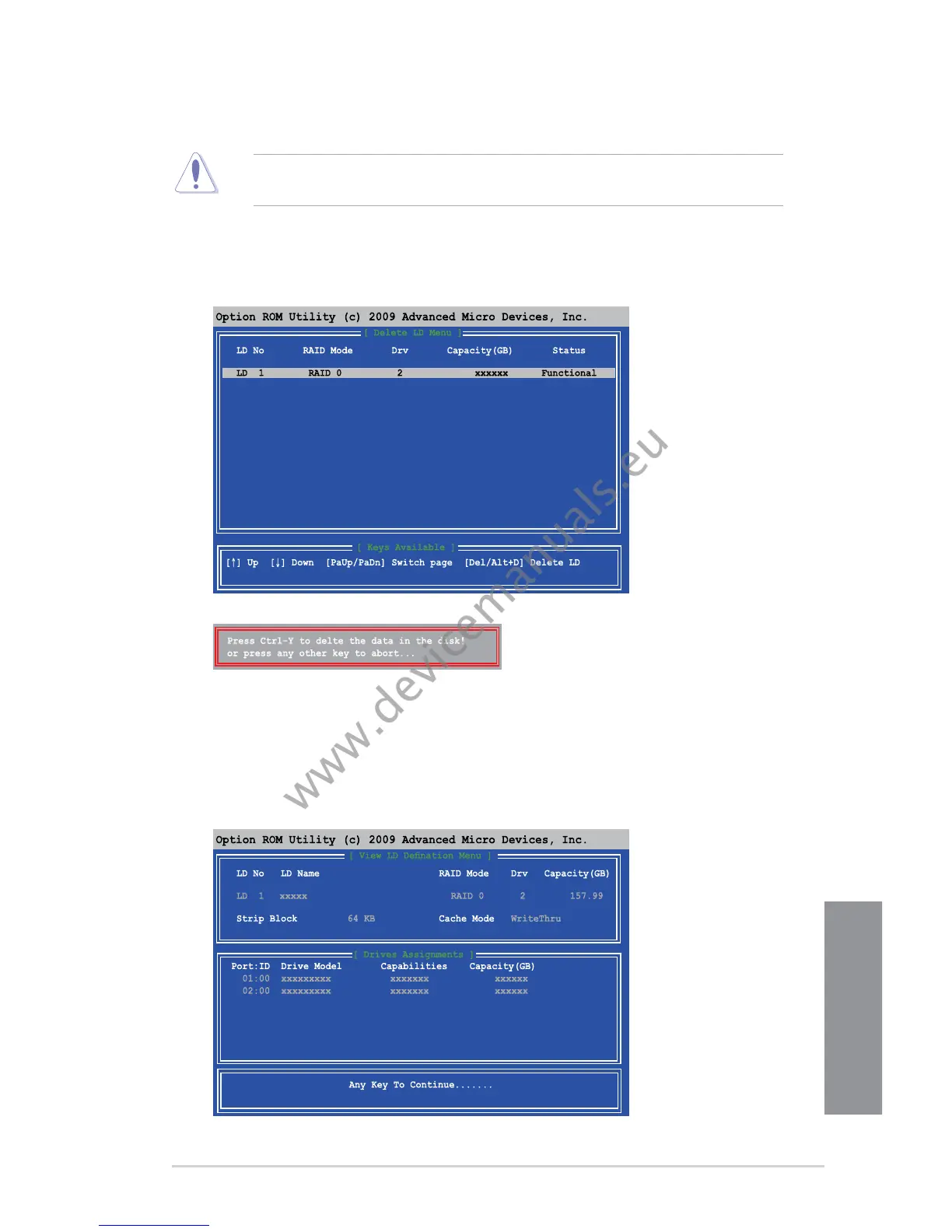 Be cautious when deleting a RAID volume. You will lose all data on the hard disk drives