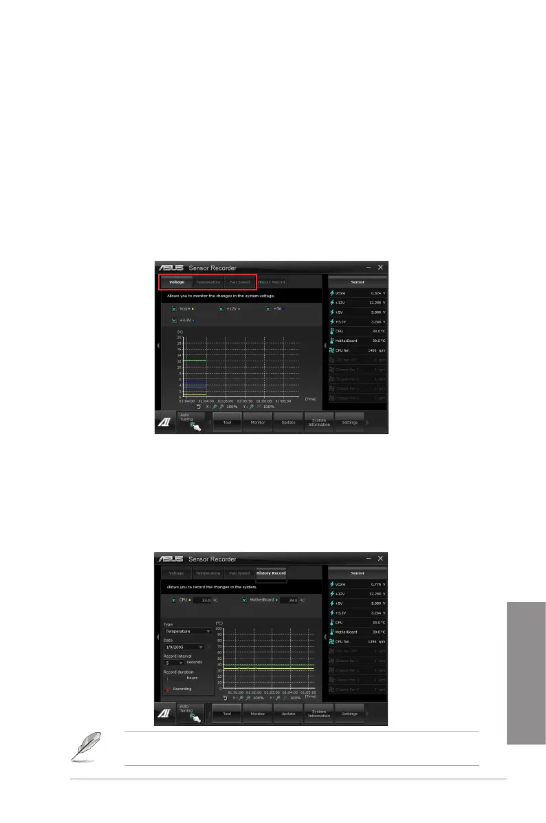 Sensor Recorder monitors the changes in the system voltage, temperature, and fan speed on