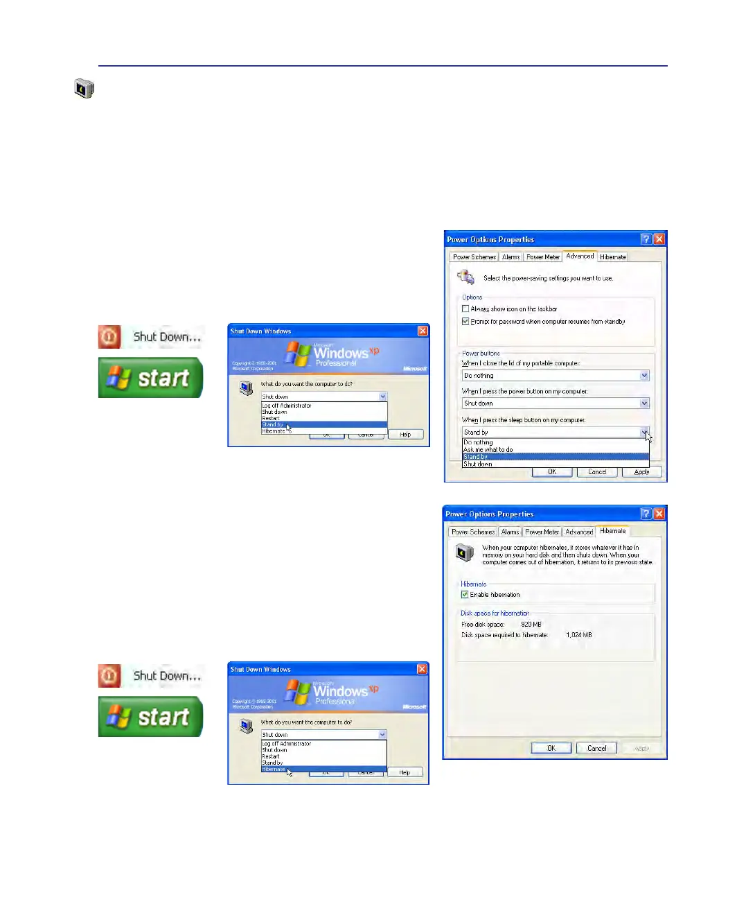 pressing the power button, or activating sleep mode. “Stand by” and “Hibernate” saves power when
