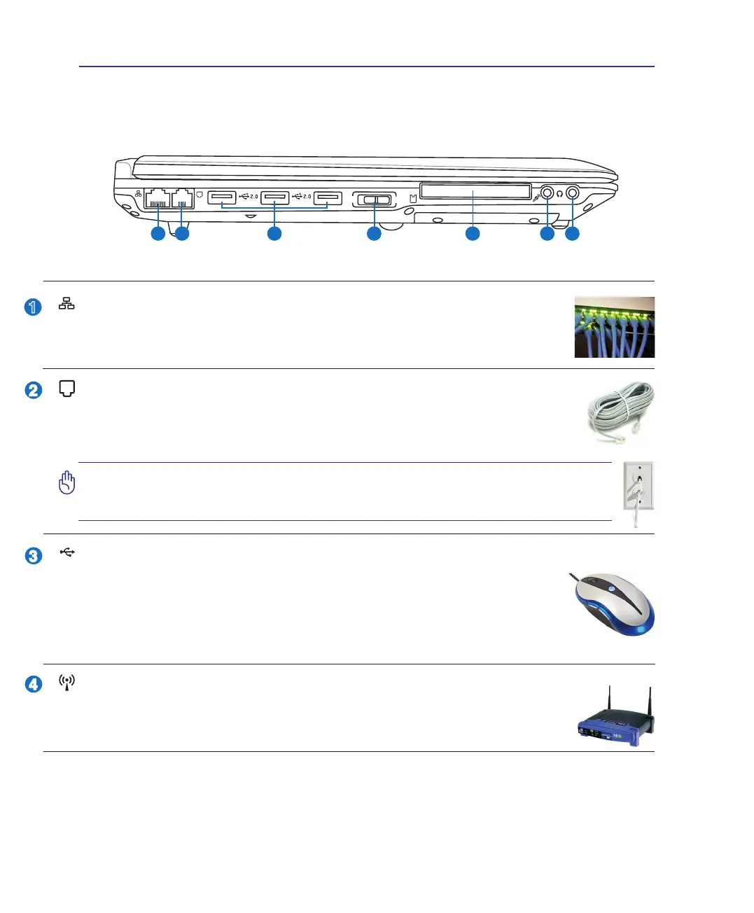 The RJ-45 LAN port with eight pins is larger than the RJ-11 modem port and supports a