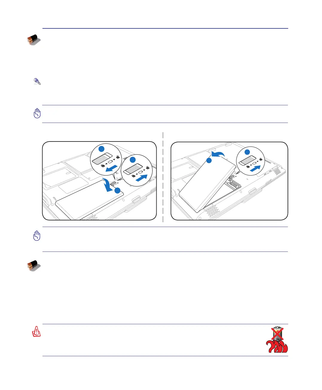 WARNING! For safety reasons, DO NOT throw the battery in re, DO NOT