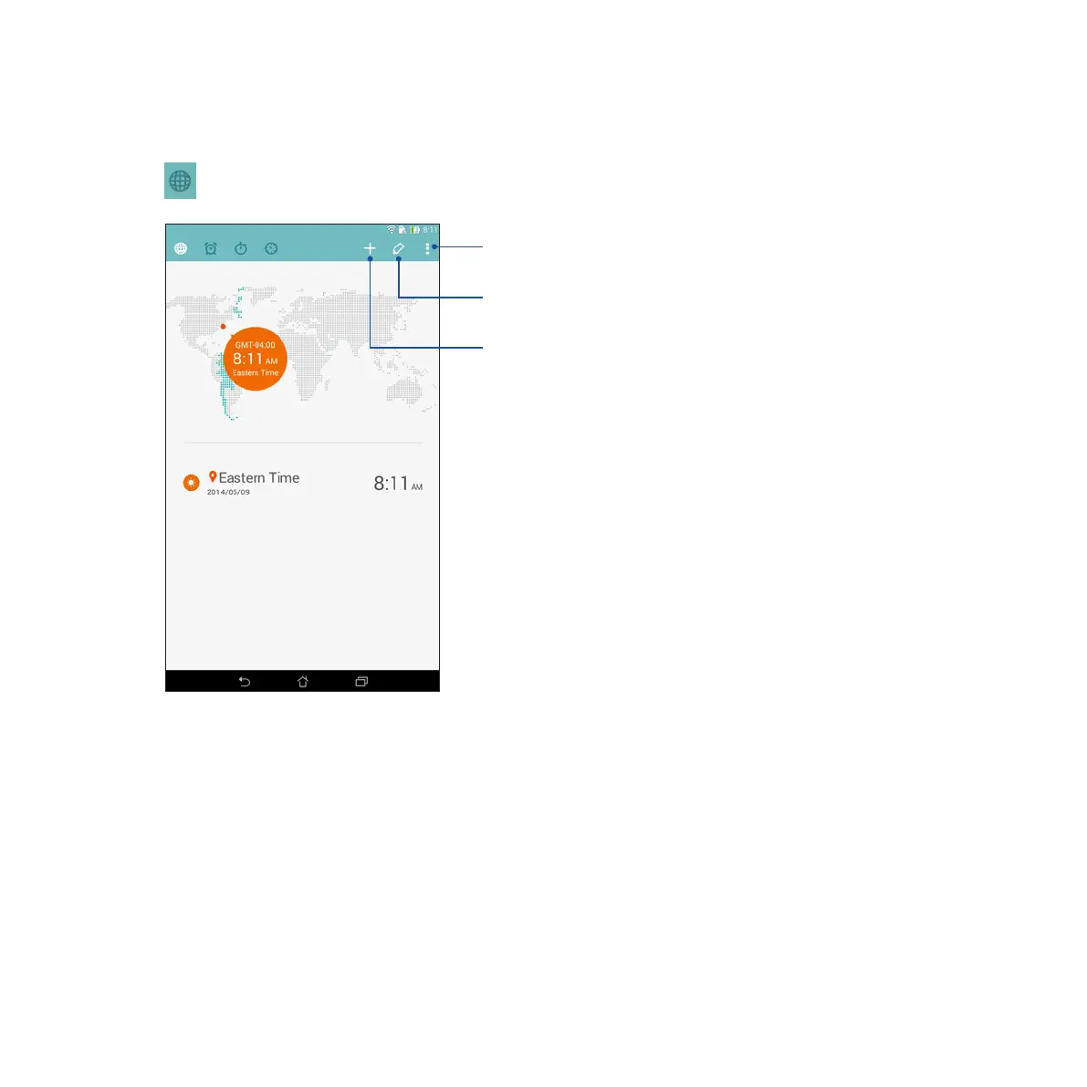Tap to access the world clock settings of your Fonepad.