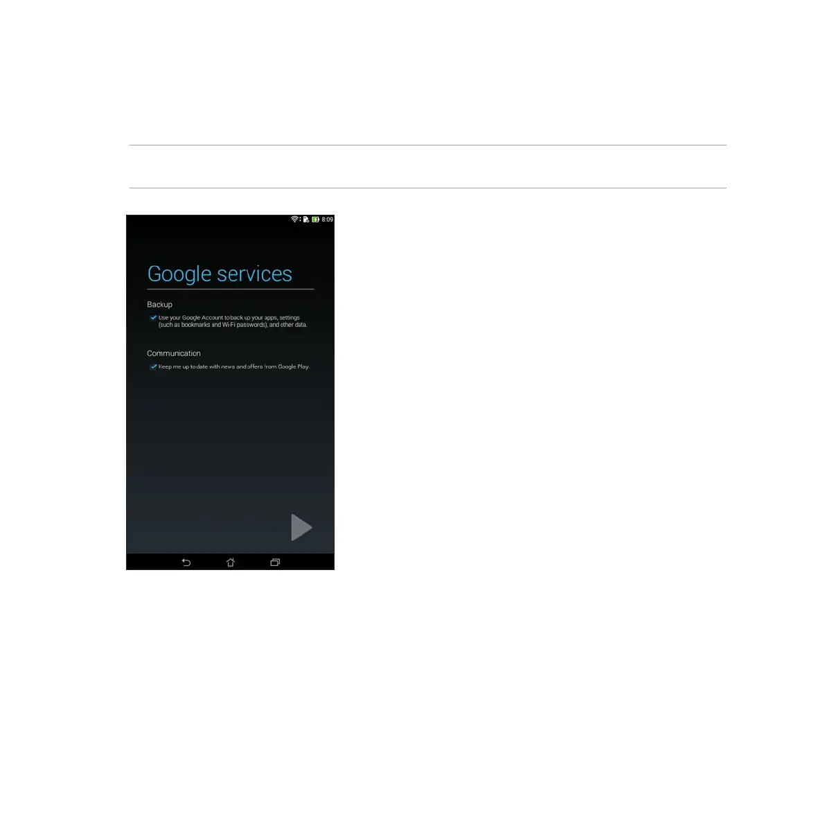 3. Use your Google account to backup and restore your settings and data. Tap [right arrow icon] to sign in to