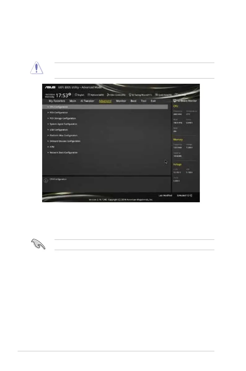 The Advanced menu items allow you to change the settings for the CPU and other system
