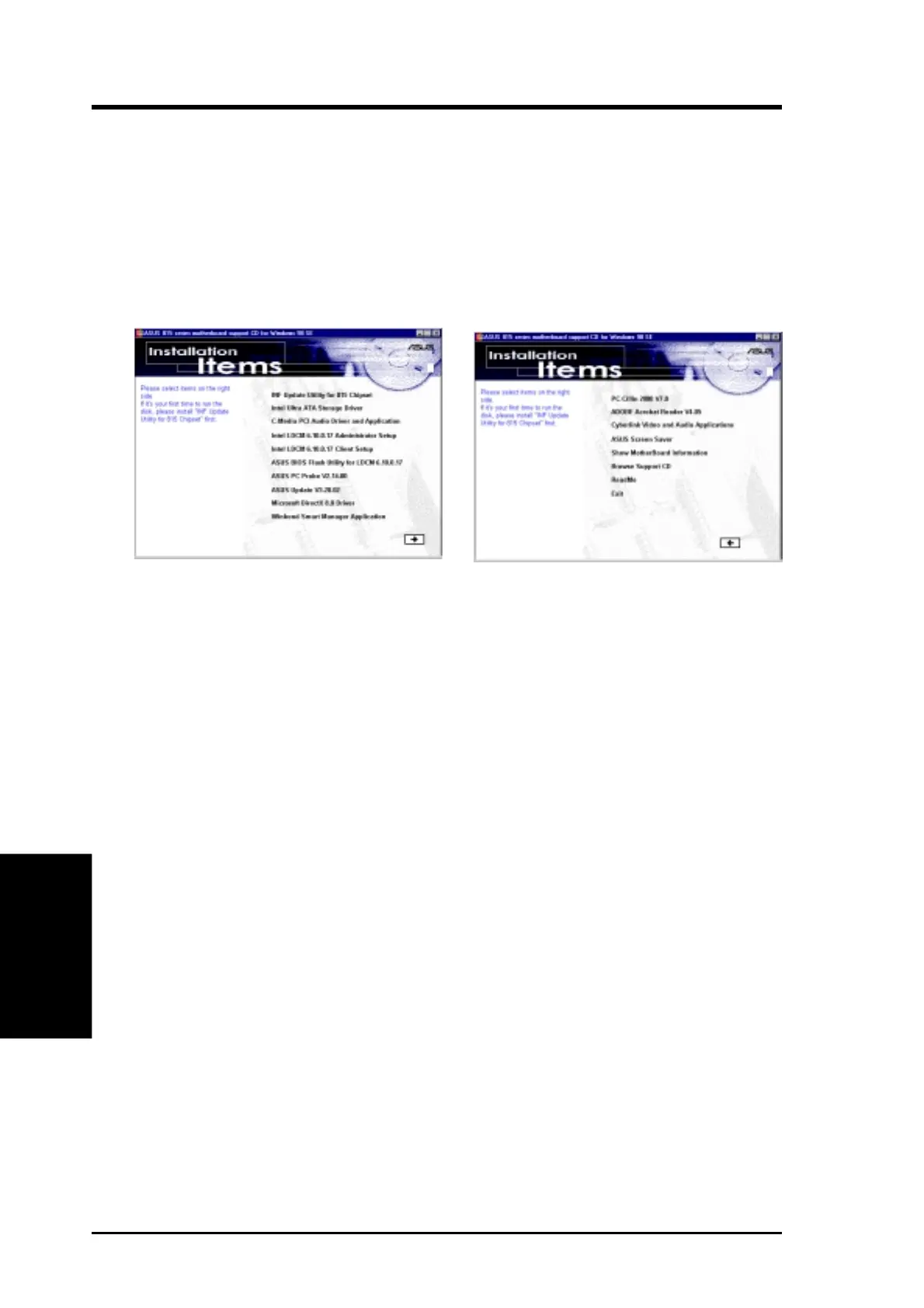 • ASUS PC Probe Vx.xx: Installs a utility to monitor your computer’s fan,