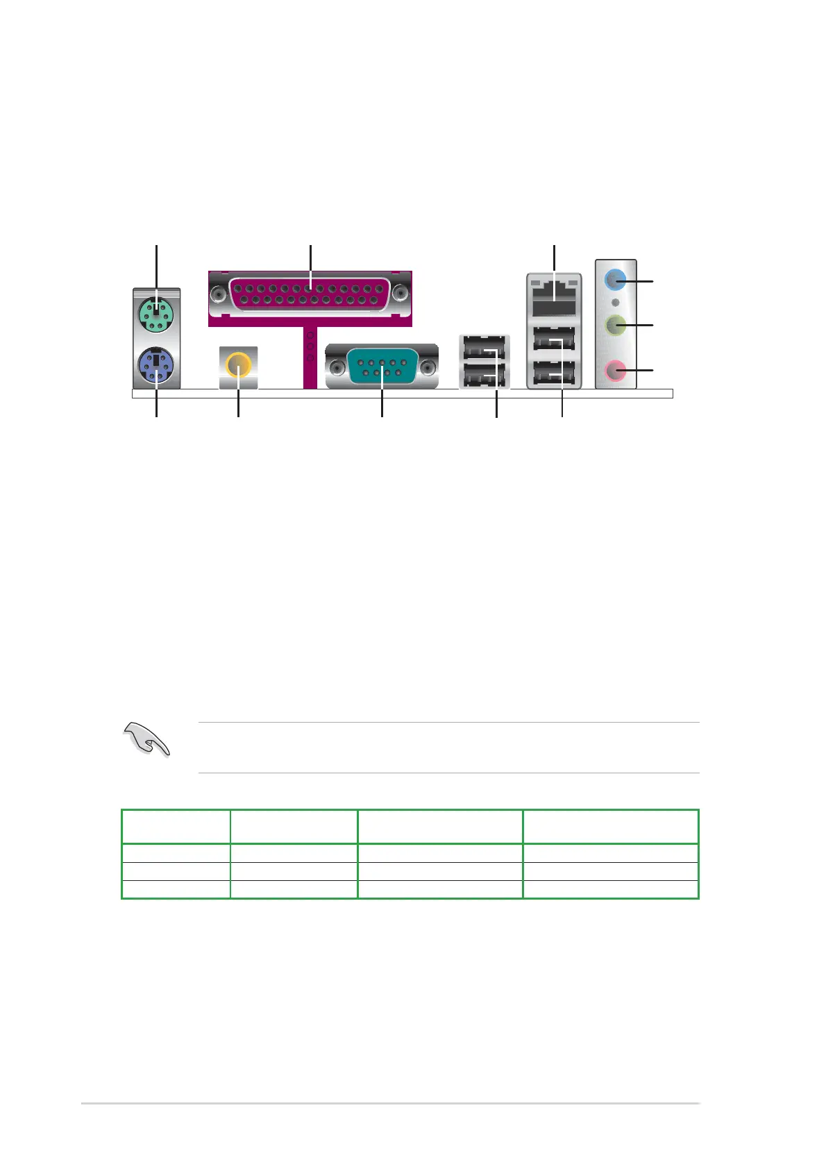 1. PS/2 mouse port. This green 6-pin connector is for a PS/2 mouse.
