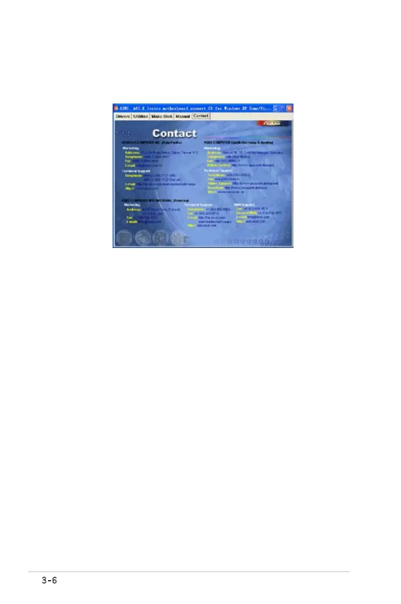 点击 Contact 键以查看华硕联系信息。您同样可以在用户手册的封面内页找到这些