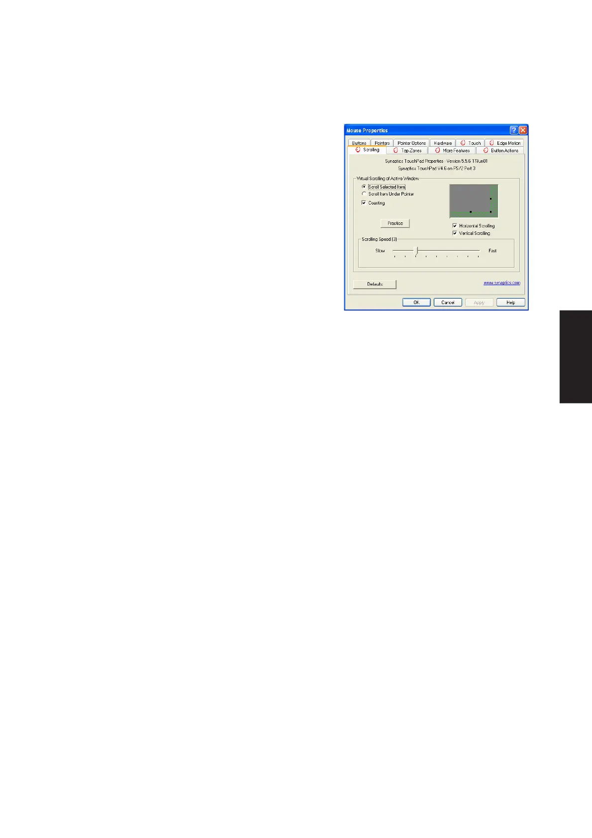 This page includes a small map of the TouchPad with the scroll zones shaded in red. See the Scroll Zone