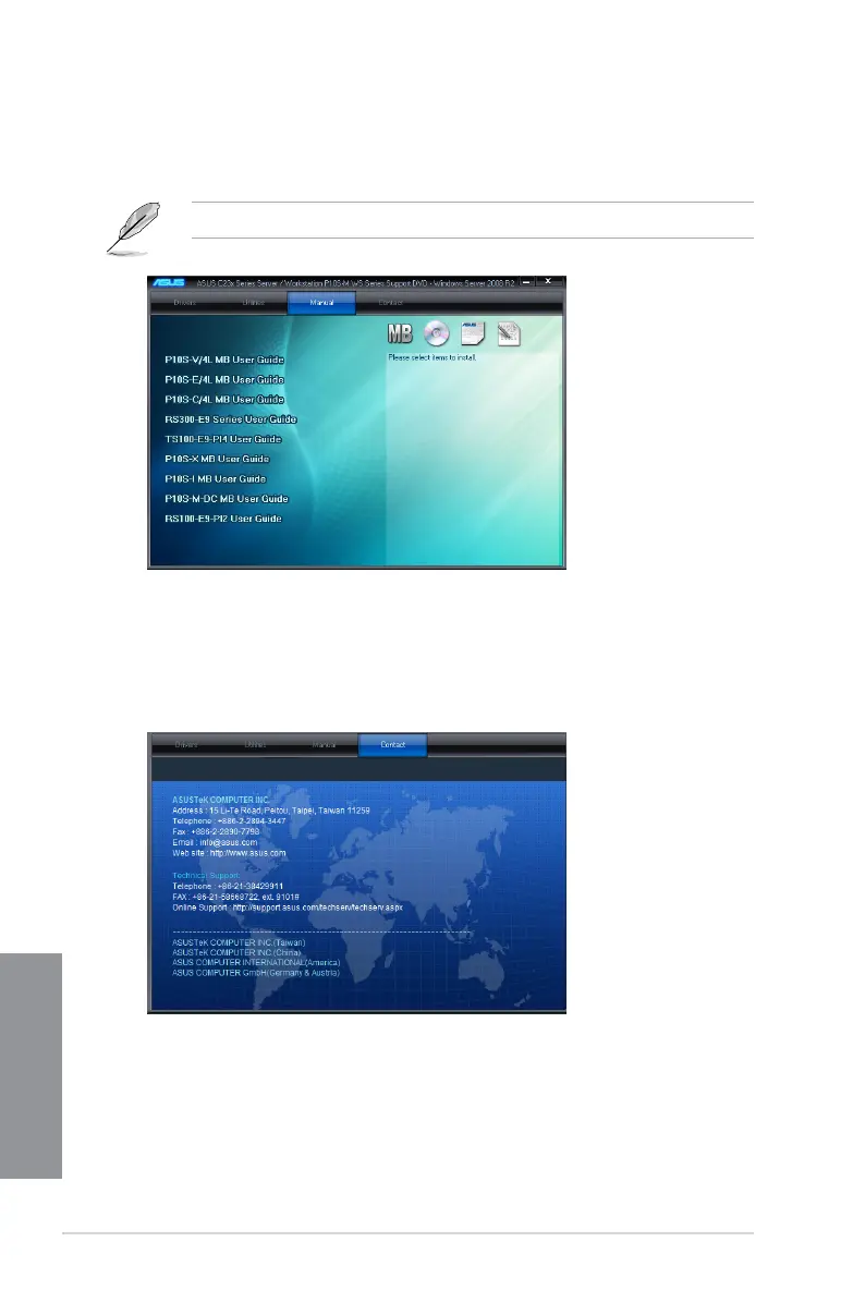 The Contact menu displays the ASUS contact information, e-mail addresses, and useful links