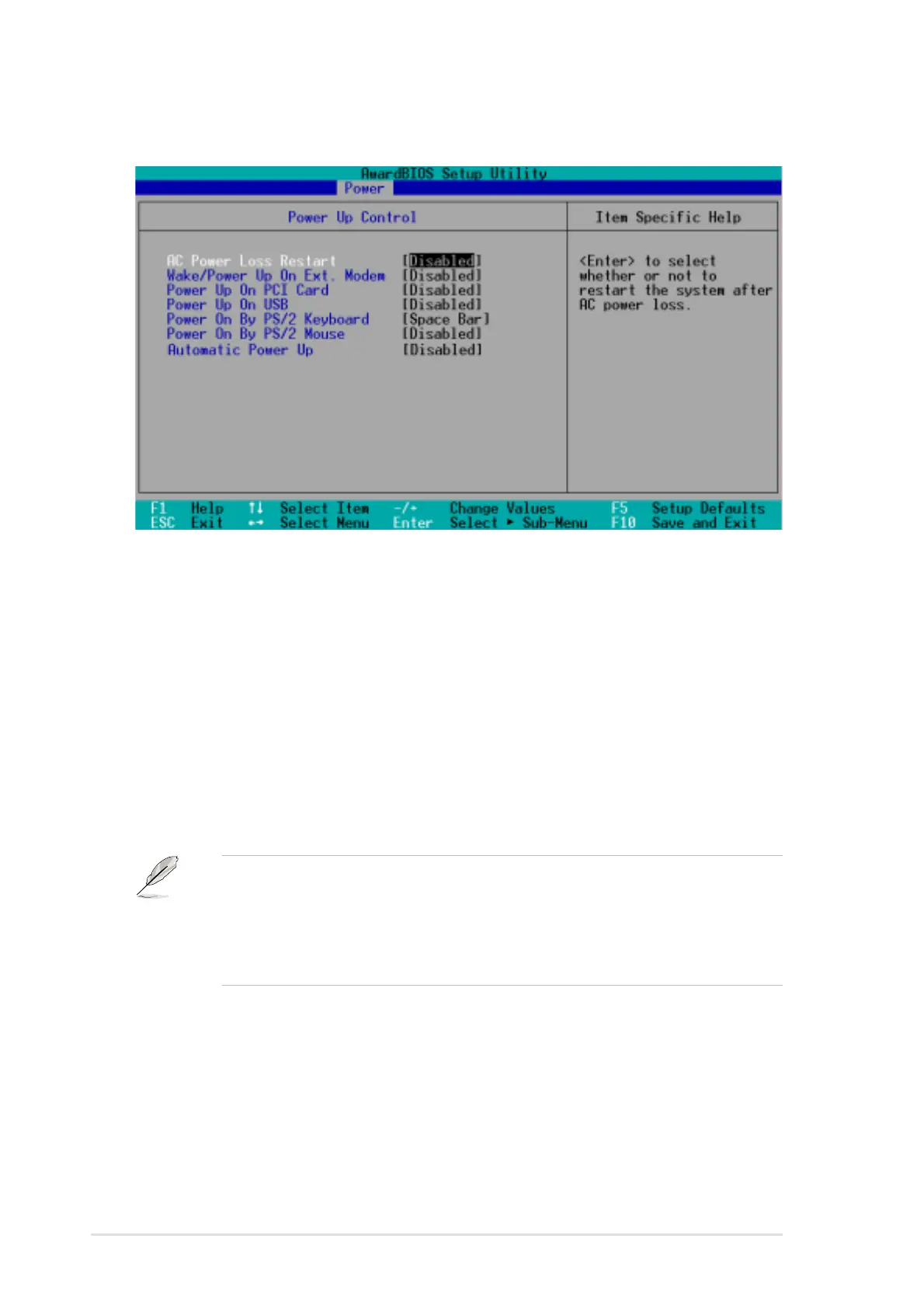 interruptions. [Disabled] leaves your system off while [Enabled] reboots the