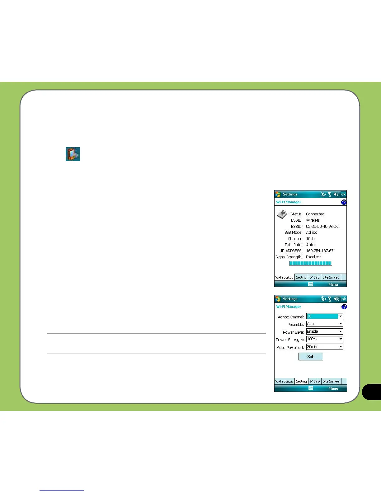 The Wi-Fi Manager shows connection status and information on a wireless network, and allows
