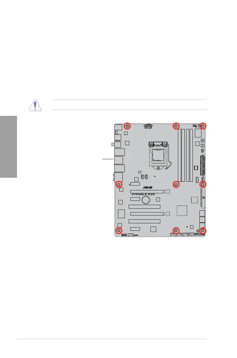 Place nine screws into the holes indicated by circles to secure the motherboard to the