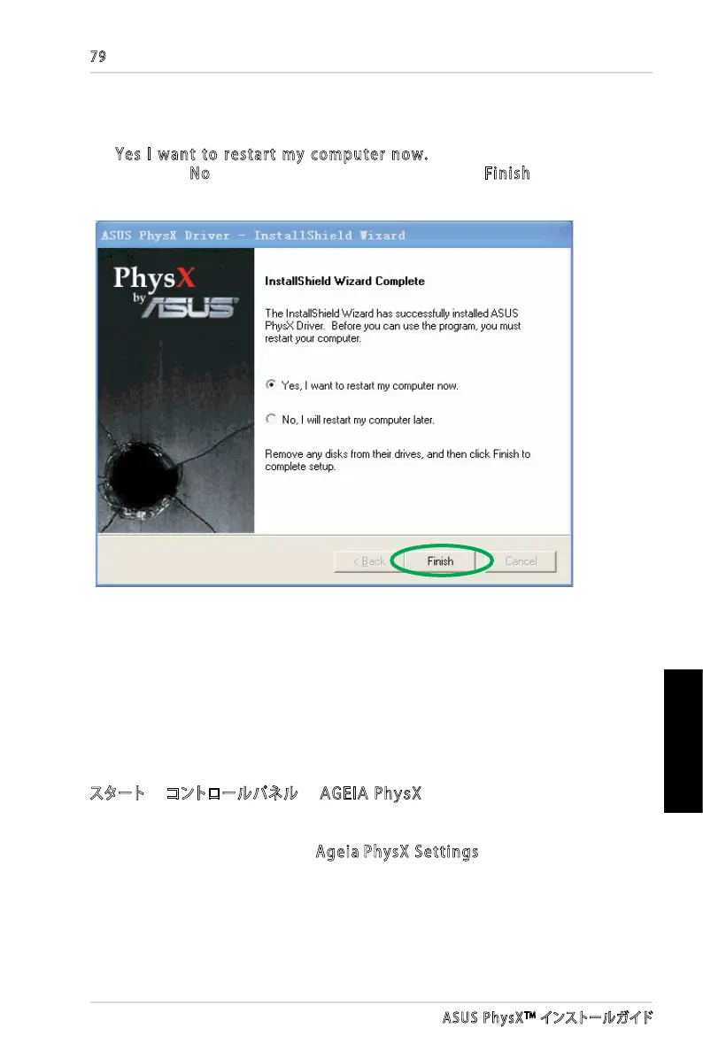 動させるか、No を選択して後でコンピュータを再起動します。Finish をクリックして