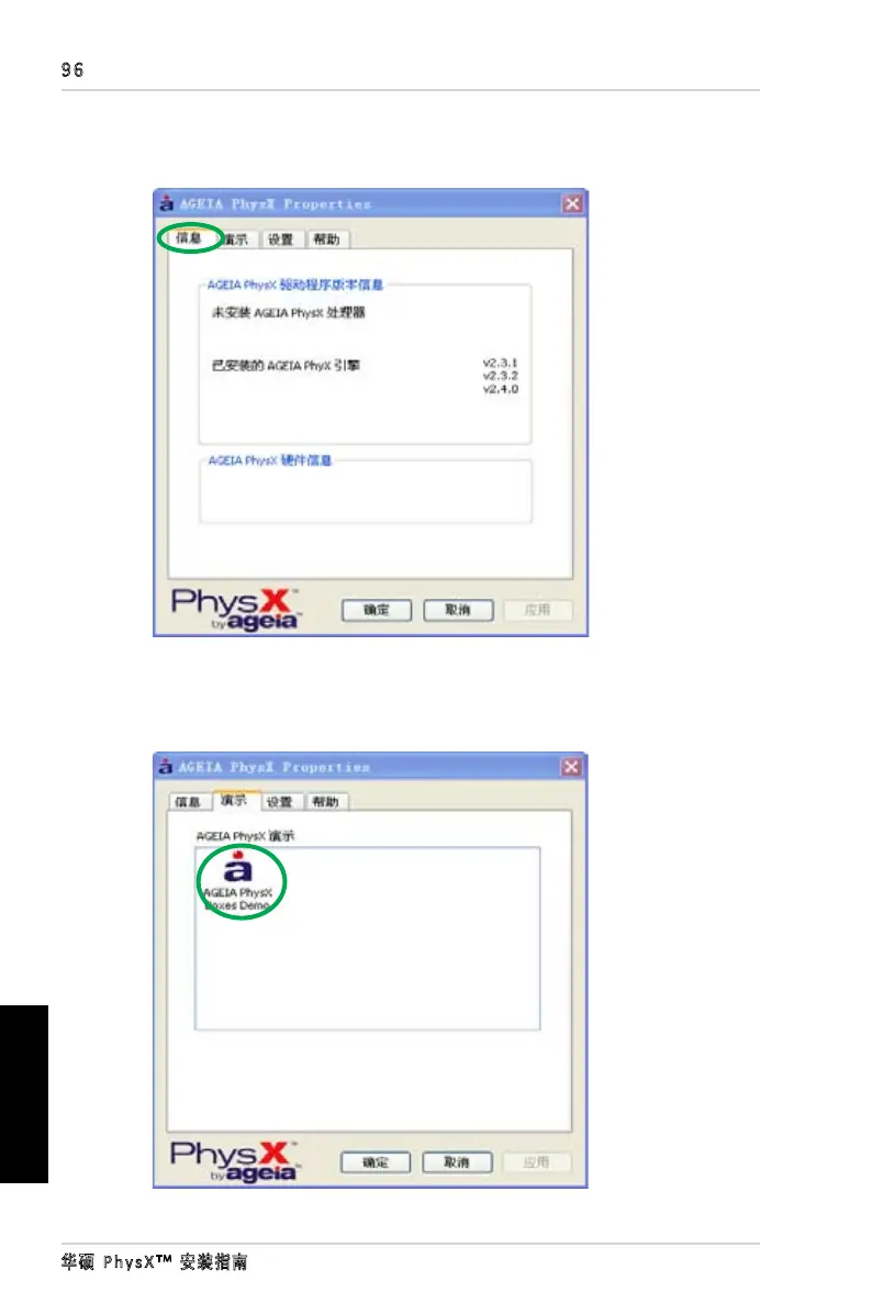 在演示窗口,点击 AGEIA Ph ysX boxes Dem o 图标启动已安装的演示。