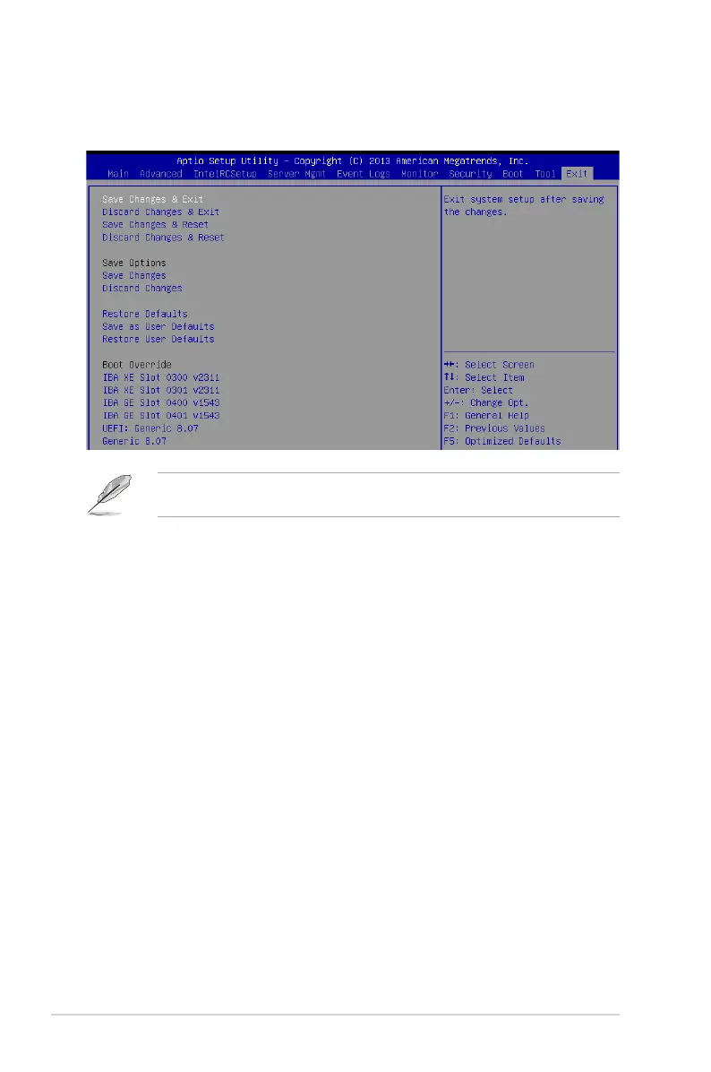 The Exit menu items allow you to save or discard your changes to the BIOS items.