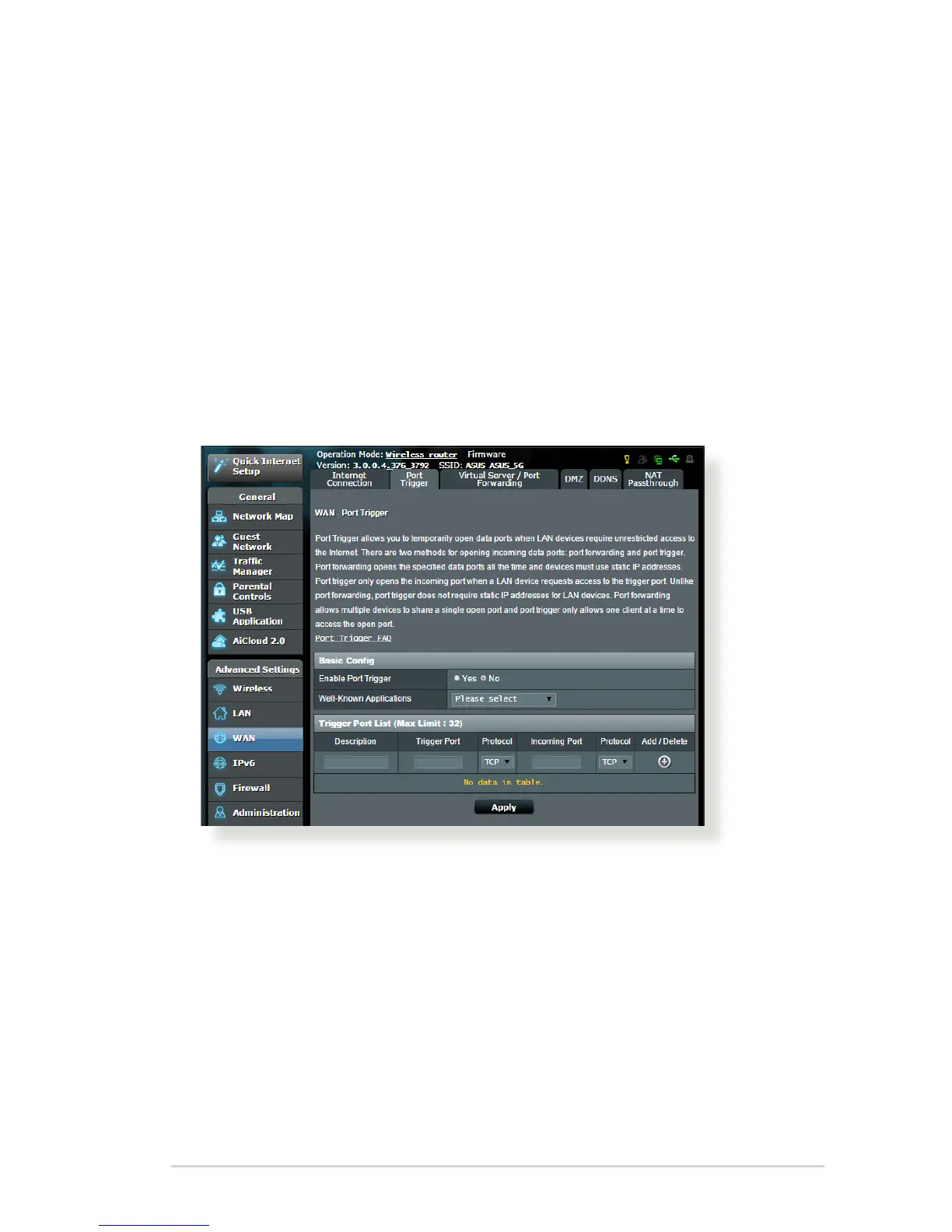 • Enable Port Trigger: Choose Yes to enable Port Trigger.