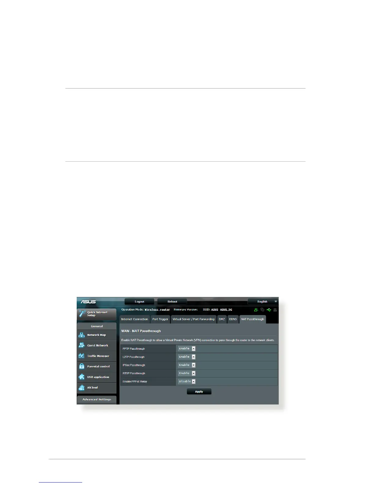 Advanced Settings > WAN > NAT Passthrough tab. When done,