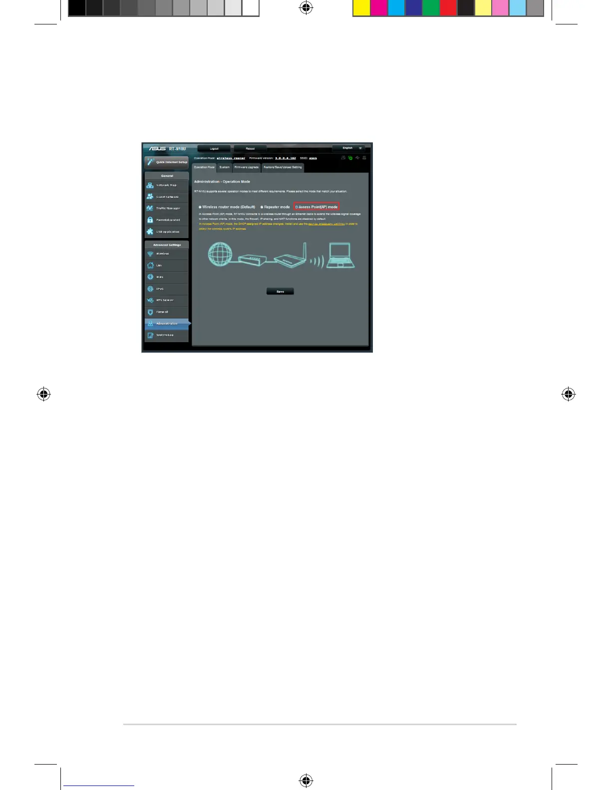 tab. Select Access Point (AP) mode. Click Save.