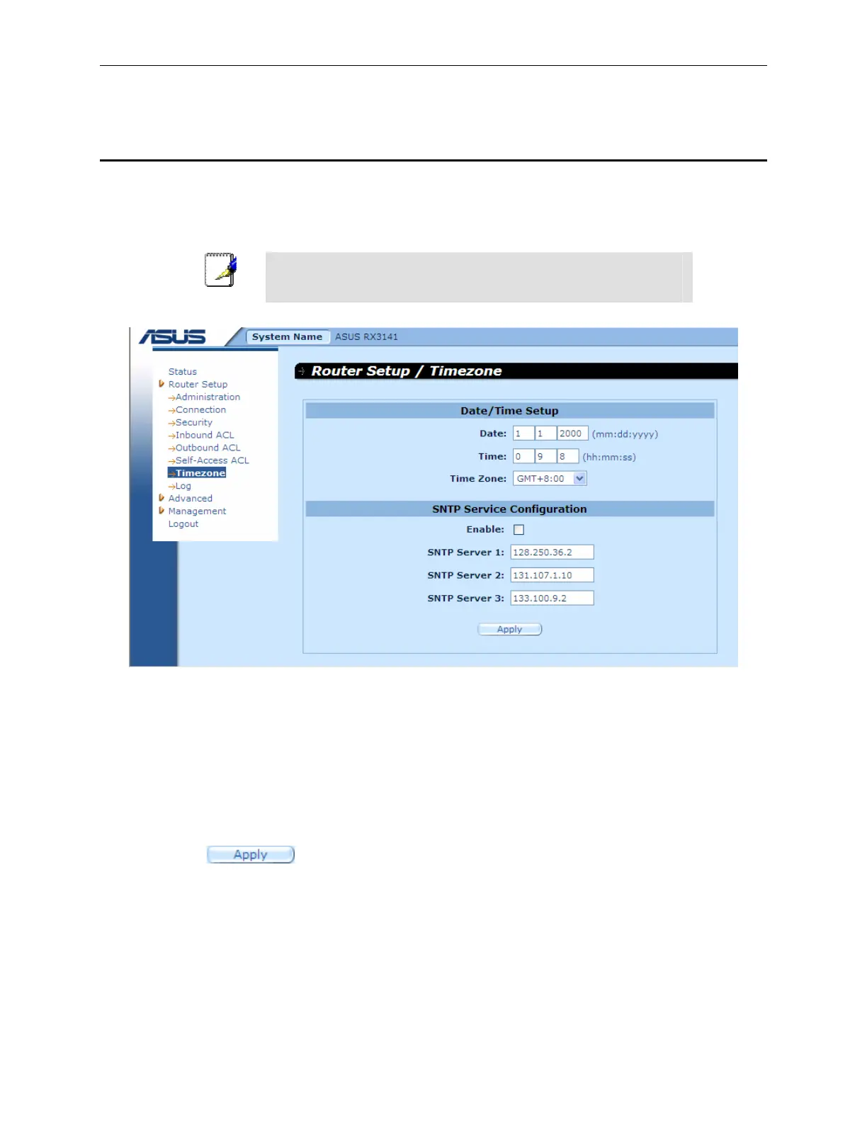 time. RX3141 allows you to configure up to three external time servers. Make sure that the “