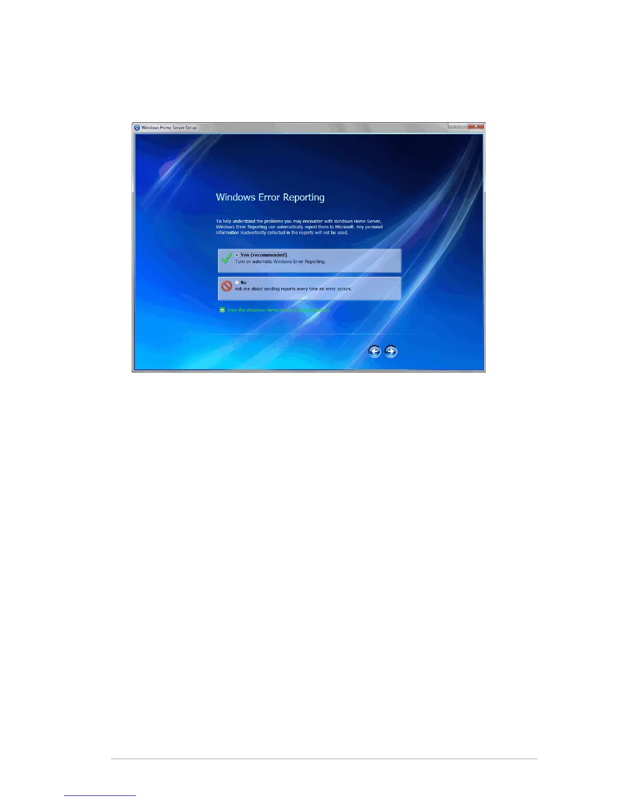 report errors to Microsoft, and then click the Next arrow.