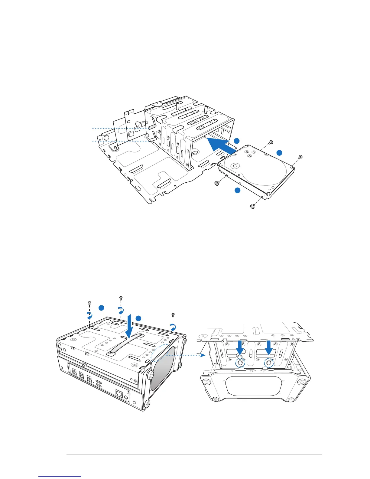 shown to the mounting holes. Push down the HDD cage to