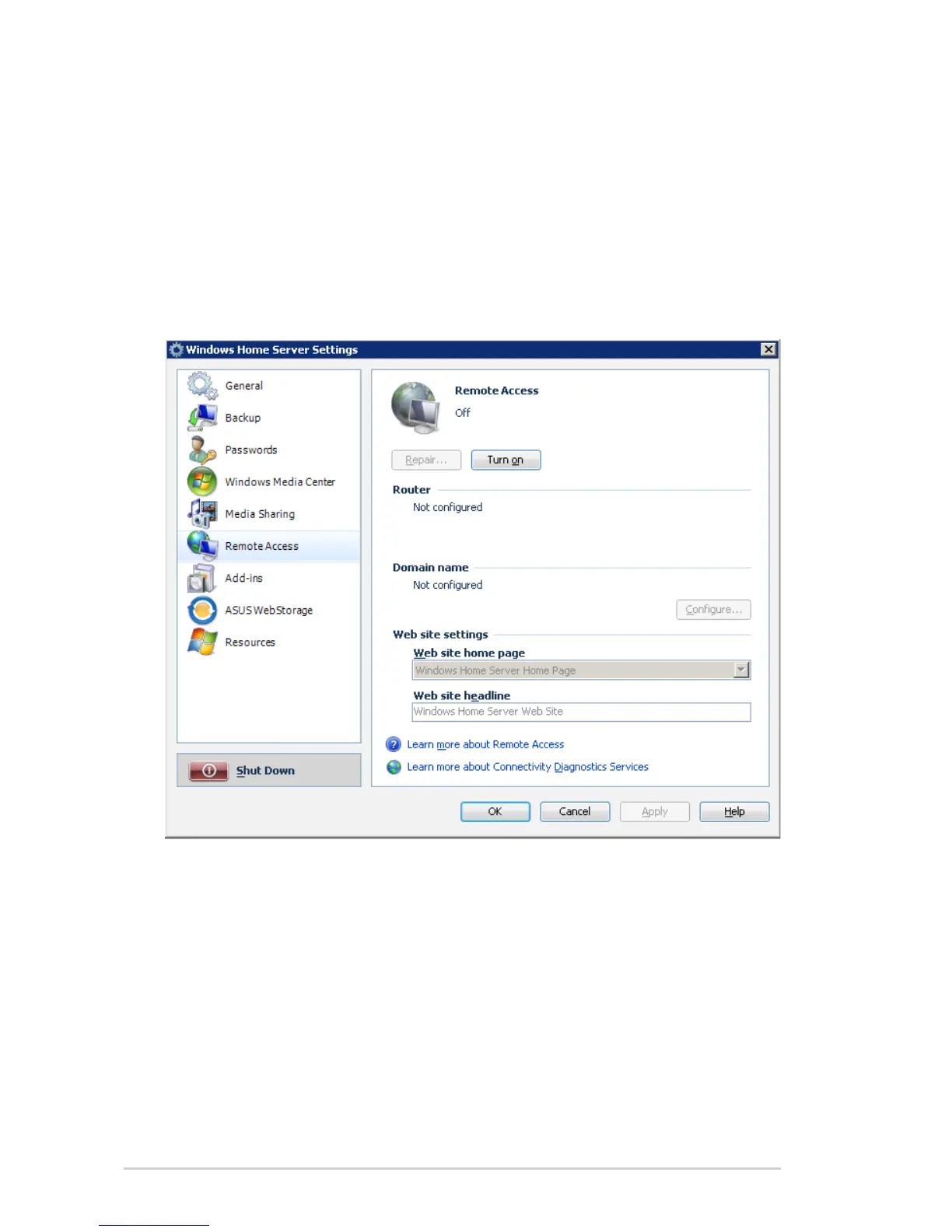 settings to access your Windows Home Server Web site from the