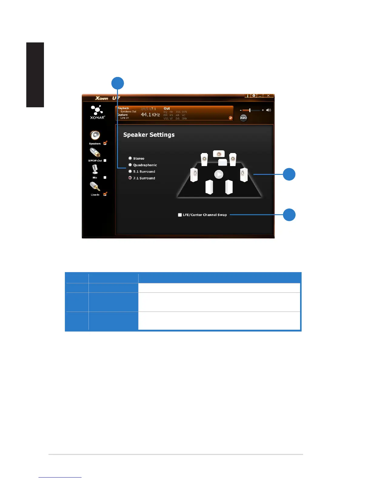 This function allows you to set the speaker numbers (stereo, quadraphonic, 5.1