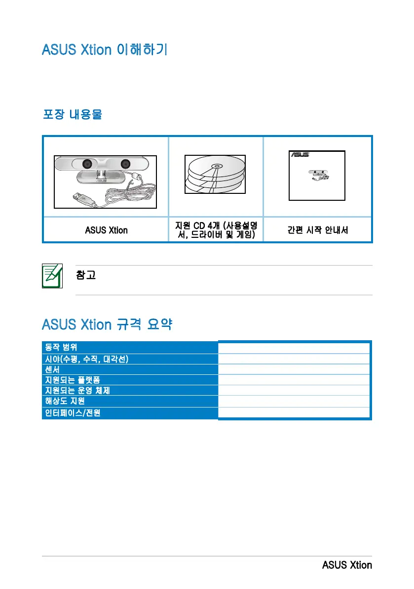 Asus Xtion - ASUS Xtion 이해하기; 포장 내용물; ASUS Xtion 규격 요약