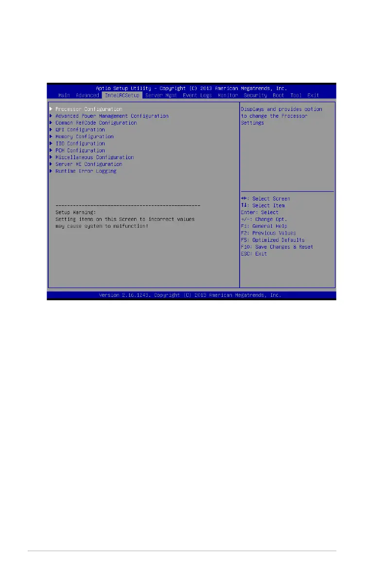 The IntelRCSetup menu items allow you to change the processor and chipset settings.