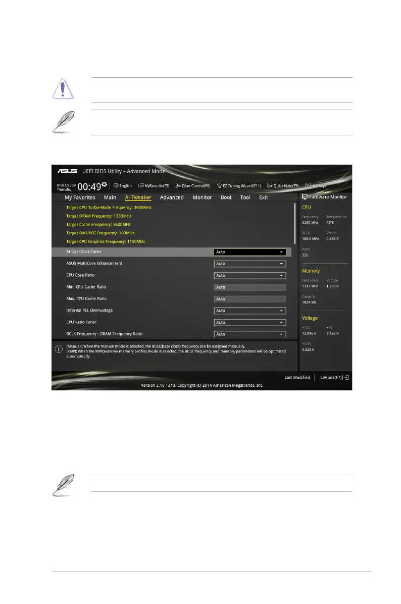 Be cautious when changing the settings of the Ai Tweaker menu items. Incorrect eld
