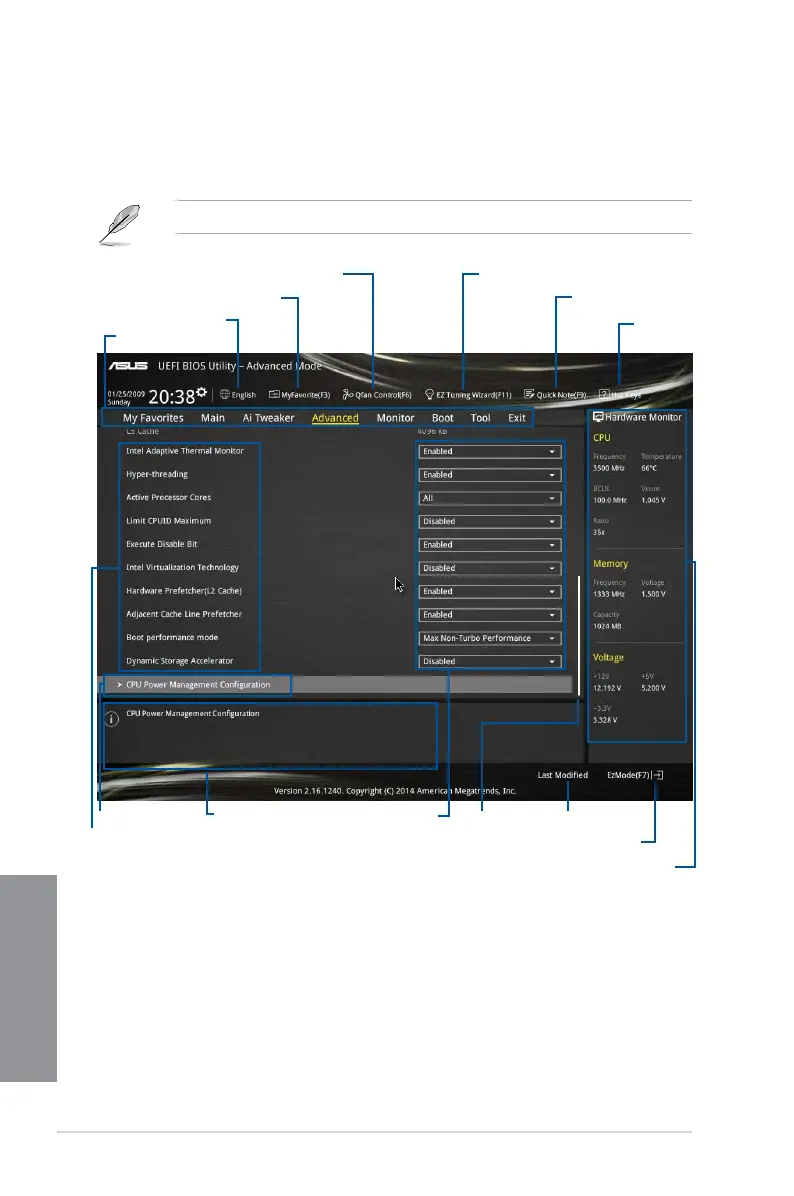 the BIOS settings. The gure below shows an example of the Advanced Mode. Refer to the